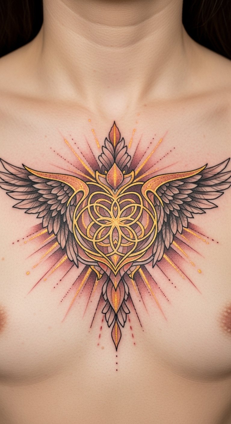 This design centers the original text’s themes by placing a heart-chakra mandala directly over the sternum, where emotion and courage feel most present. The seed-of-life geometry layered into the heart shape represents personal transformation and interconnected experiences, while subtle wing motifs suggest liberation and spiritual ascent. Fine-line dotwork and warm gold accents convey tenderness and empowerment without overpowering the chest’s natural contours; placement radiates toward the clavicles so the piece reads as both intimate and expansive, inviting wearers to carry their narrative visibly over the heart.