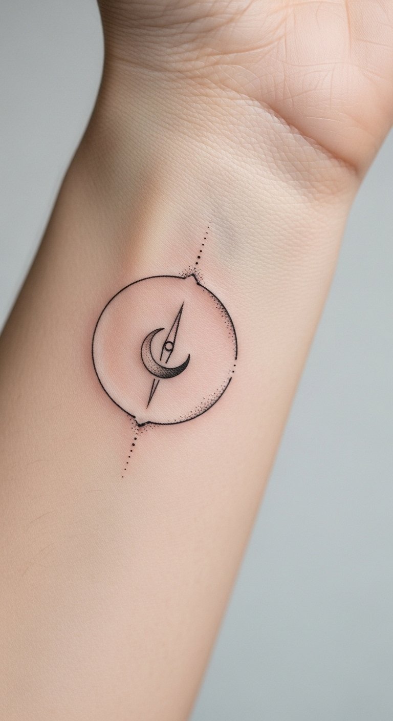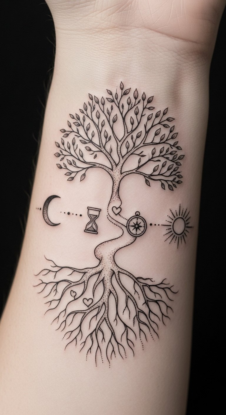 This design uses the tree as growth and grounding, roots-as-path to symbolize life’s journey, and small milestone icons to mark pivotal moments; the crescent and sun represent cycles and balance. Emotionally it evokes reflection, resilience, and personal freedom, intended for the inner wrist where it remains intimate yet visible, wrapping slightly toward the forearm so the narrative reads along the arm as a continuous personal map.