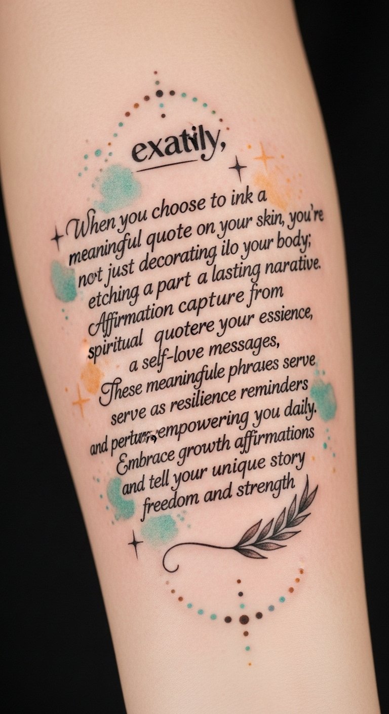When placed along the inner forearm, the full quote becomes a private, readable mantra that unfolds with movement—its handwritten flow suggests intimacy and ongoing self-dialogue. The watercolor washes add emotional warmth and a sense of healing, while the laurel branch and tiny stars symbolize victory, growth, and quiet aspiration. The combination of script and subtle decorative elements keeps the focus on the words while enhancing meaning, making the tattoo both a resilience talisman and an elegant visual statement suitable for daily empowerment.
