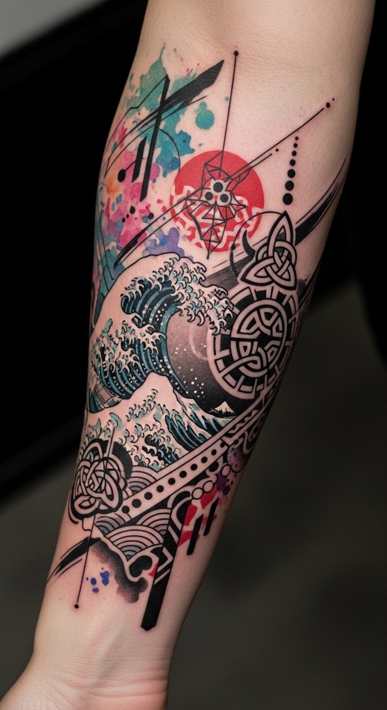 Best placed along the outer forearm to allow the flow of waves and brushstrokes to follow the arm’s movement, with sizes adjusted so fine-line geometry reads clearly and bold silhouettes anchor the composition.
