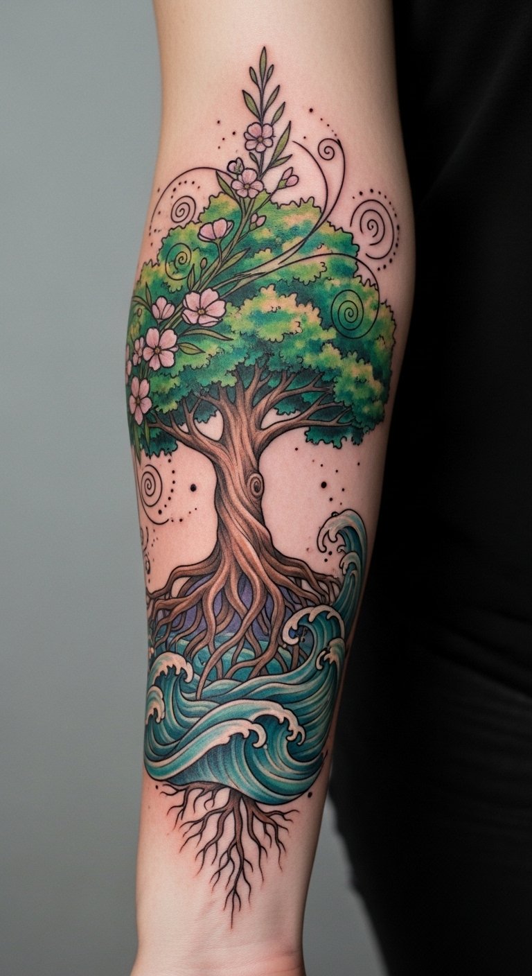 The tree and roots symbolize endurance and grounding, the waves convey liberation and flow, and the wildflowers add tenderness and renewal; the watercolor tones evoke emotional depth while the inner forearm placement allows personal visibility and intimacy, making each movement a reminder of growth and connection.