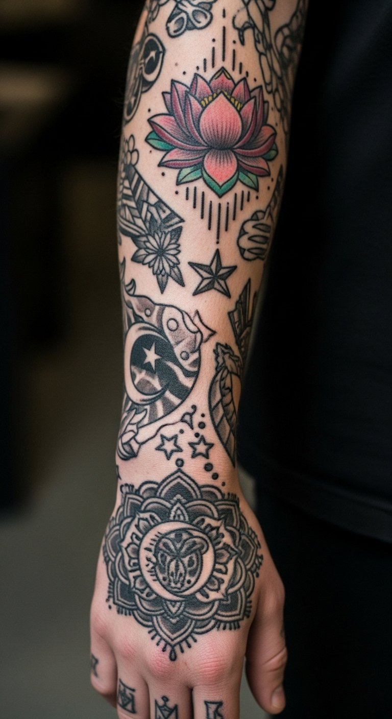 Mandalas and lotus flowers intertwine beautifully, creating a visual symphony that represents harmony and balance in your life. Embrace the mandalas’ significance, reflecting spiritual balance through intricate, harmonious patterns. The lotus symbolizes purity and enlightenment, enriching your artistic expressions. These intertwined designs not only celebrate your journey but also inspire freedom, reminding you of your potential to bloom amidst challenges. Place the design over the sternum for a central, grounding effect, or along the forearm or upper back where the flowing lines can follow muscle contours; the piece evokes calm resilience, personal growth, and serene confidence through its balanced geometry and organic floral motifs.