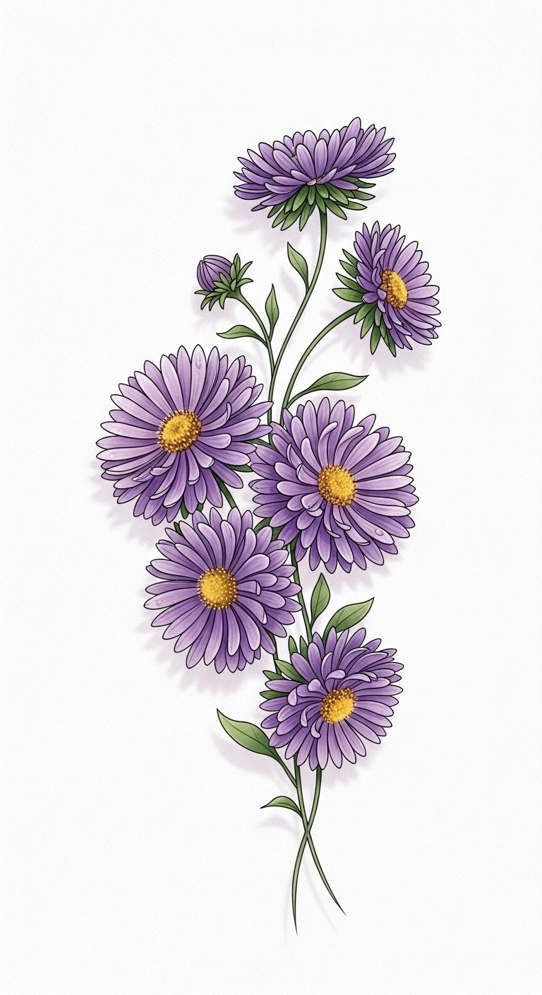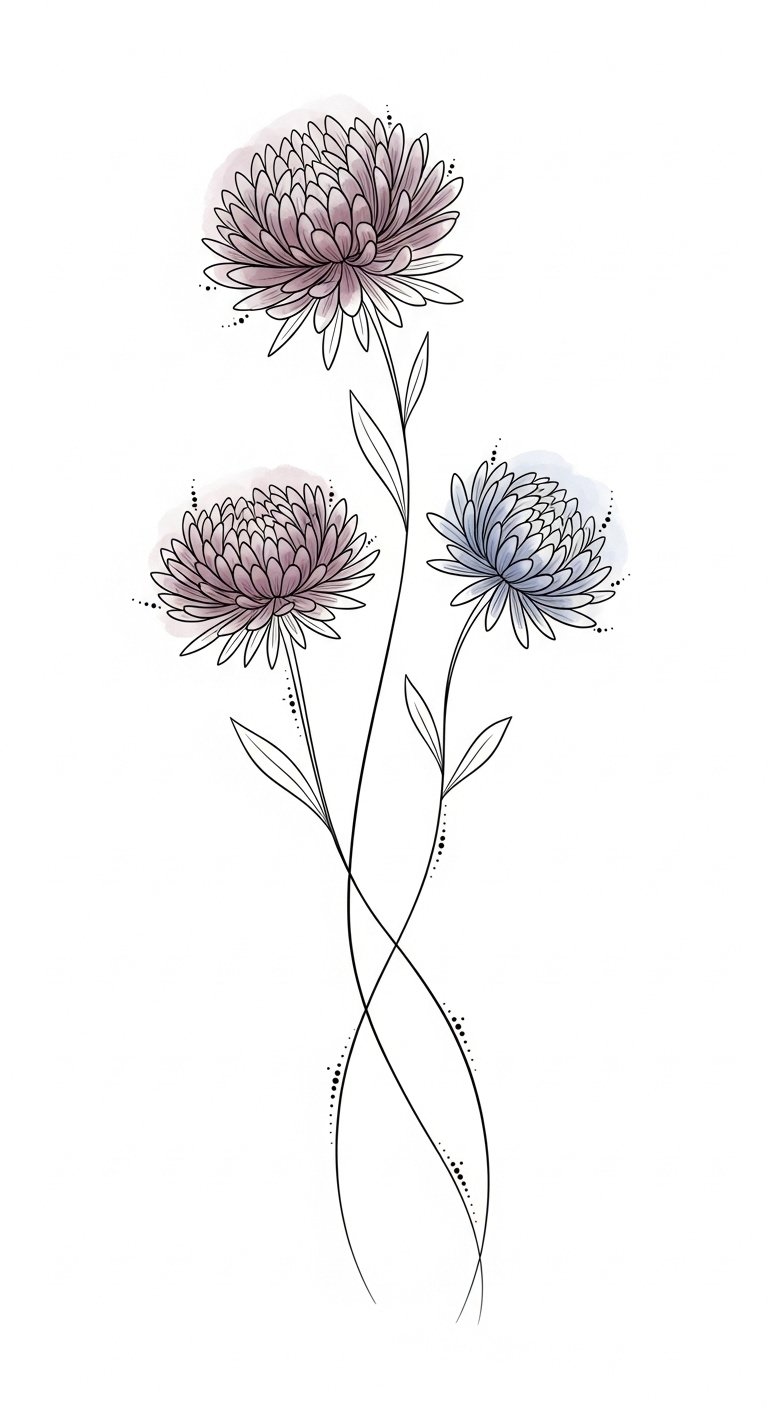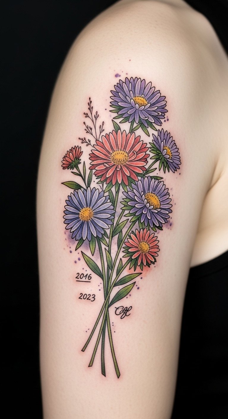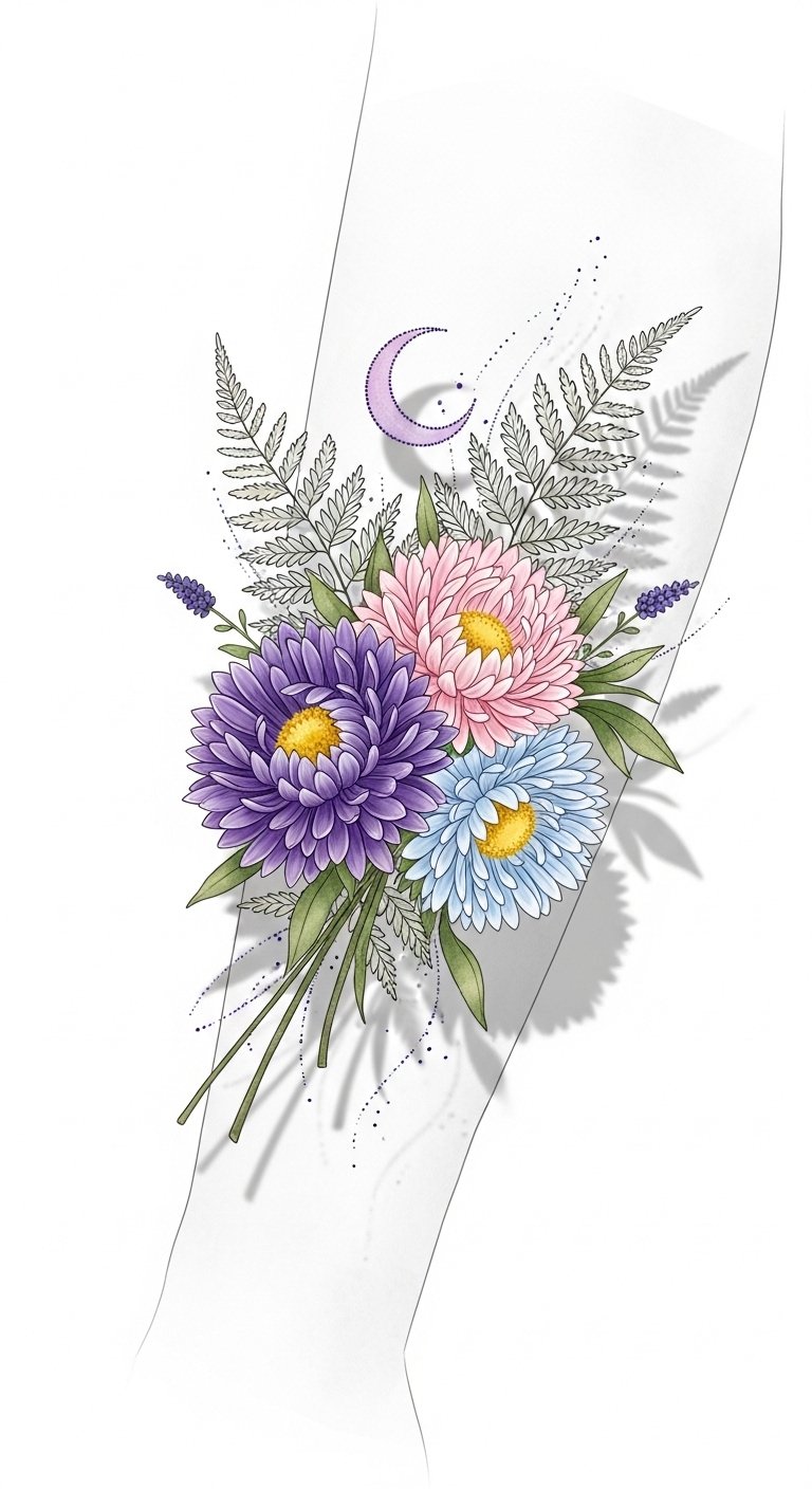 This design centers on a cluster of aster blossoms chosen to represent distinct moments or people in your life: varied petal shapes for different experiences, color choices tied to emotions (deep lavender for resilience, pale pink for tenderness, blue for calm), and tiny integrated symbols (a small date tucked into a leaf curve, initials hidden in stem lines) to make the piece intimate. The fine-line and watercolor blend create a gentle, emotional tone—suitable for visible yet personal placements such as the inner forearm for frequent reflection, the shoulder blade for a more private display, or behind the ear for a quiet, secretive reminder.
