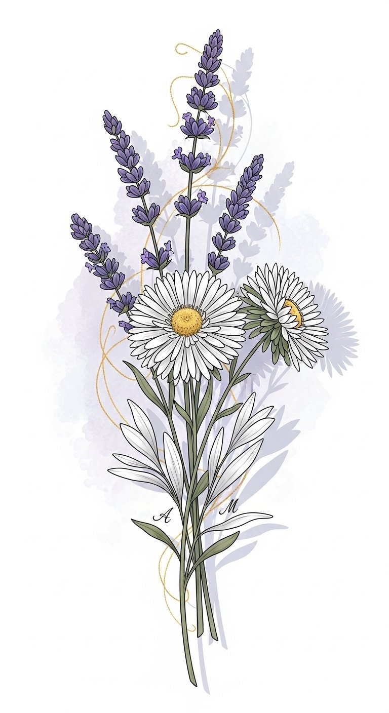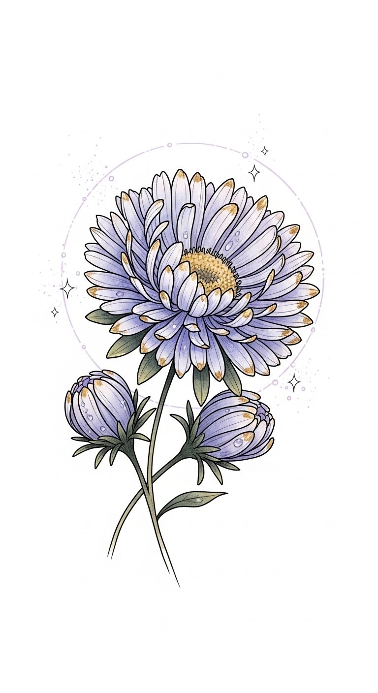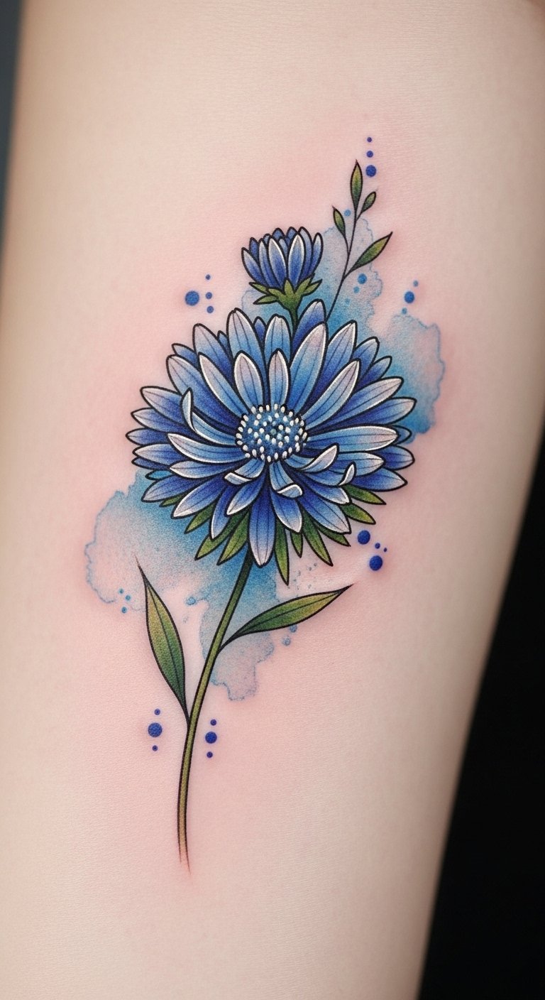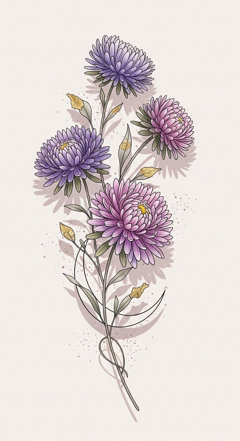 This design centers on a cluster of aster blossoms chosen to represent distinct moments or people in your life: varied petal shapes for different experiences, color choices tied to emotions (deep lavender for resilience, pale pink for tenderness, blue for calm), and tiny integrated symbols (a small date tucked into a leaf curve, initials hidden in stem lines) to make the piece intimate. The fine-line and watercolor blend create a gentle, emotional tone—suitable for visible yet personal placements such as the inner forearm for frequent reflection, the shoulder blade for a more private display, or behind the ear for a quiet, secretive reminder.