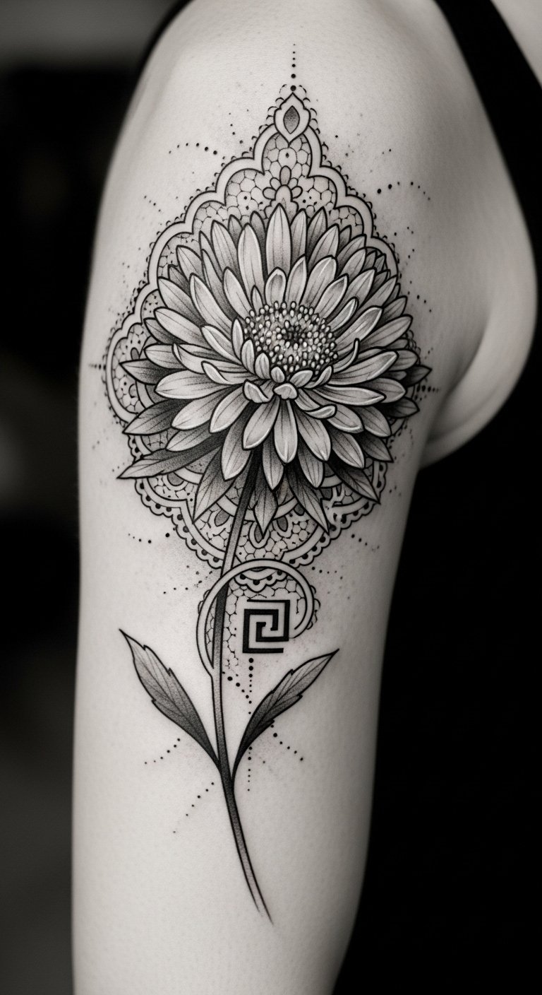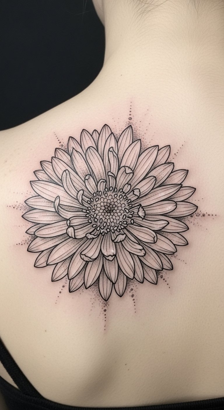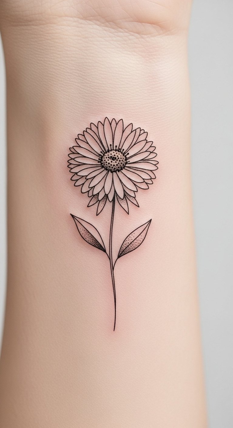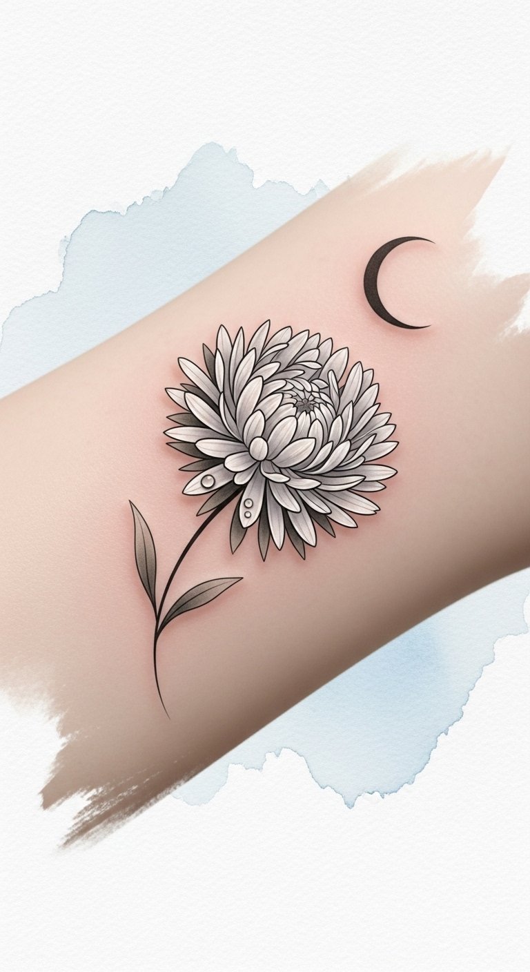 The design pairs fine, precise lines with soft gray shading to emphasize each petal’s graceful movement; placed along the forearm, clavicle, or behind the ear, it reads both intimate and visible depending on orientation. Symbolically the aster represents patience and elegance, the delicate line work conveying quiet resilience and personal growth; emotionally the piece feels calming and poetic, suitable for someone who wants subtlety and refinement in their self-expression while allowing the artwork to complement natural body contours.