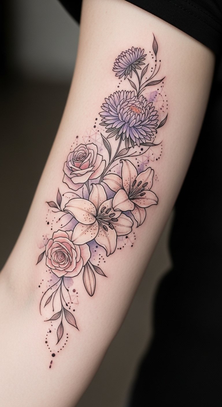 A graceful forearm placement allows the mixed-flower design to flow with the arm’s natural lines, conveying layered emotions—romantic balance from the roses, serene purity and renewal from the lilies, and quiet resilience from the asters—while watercolor tones lend a dreamy, personal feel; ideal for someone seeking a meaningful, elegant piece that reads both intimate and visually harmonious.