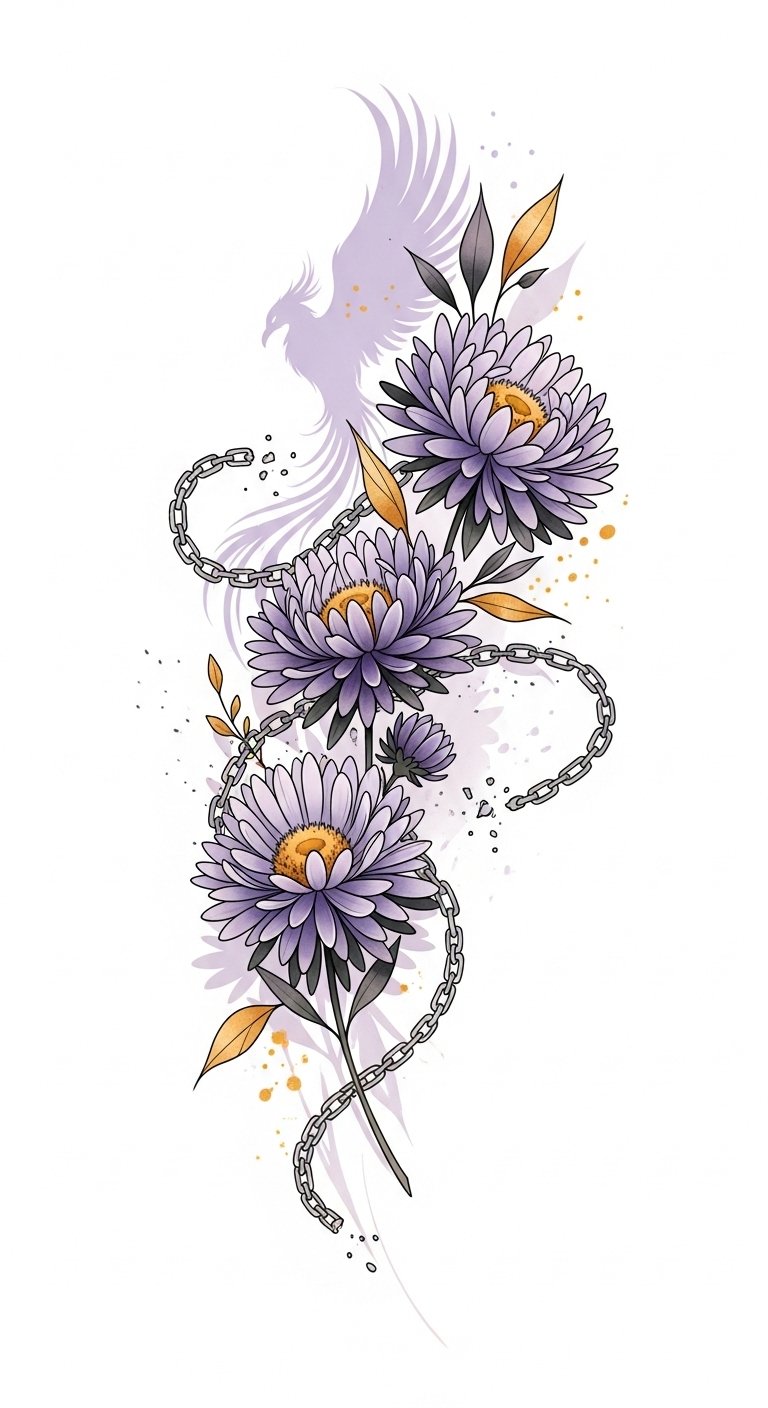 As you embrace change, this tattoo becomes a vibrant reminder of your strength, encouraging you to blossom into the person you’re destined to be. The intertwined asters and broken chains represent liberation from past constraints, while the phoenix silhouette suggests rebirth; lavender and violet convey calm, healing, and dignity, gold accents signify courage and triumph.