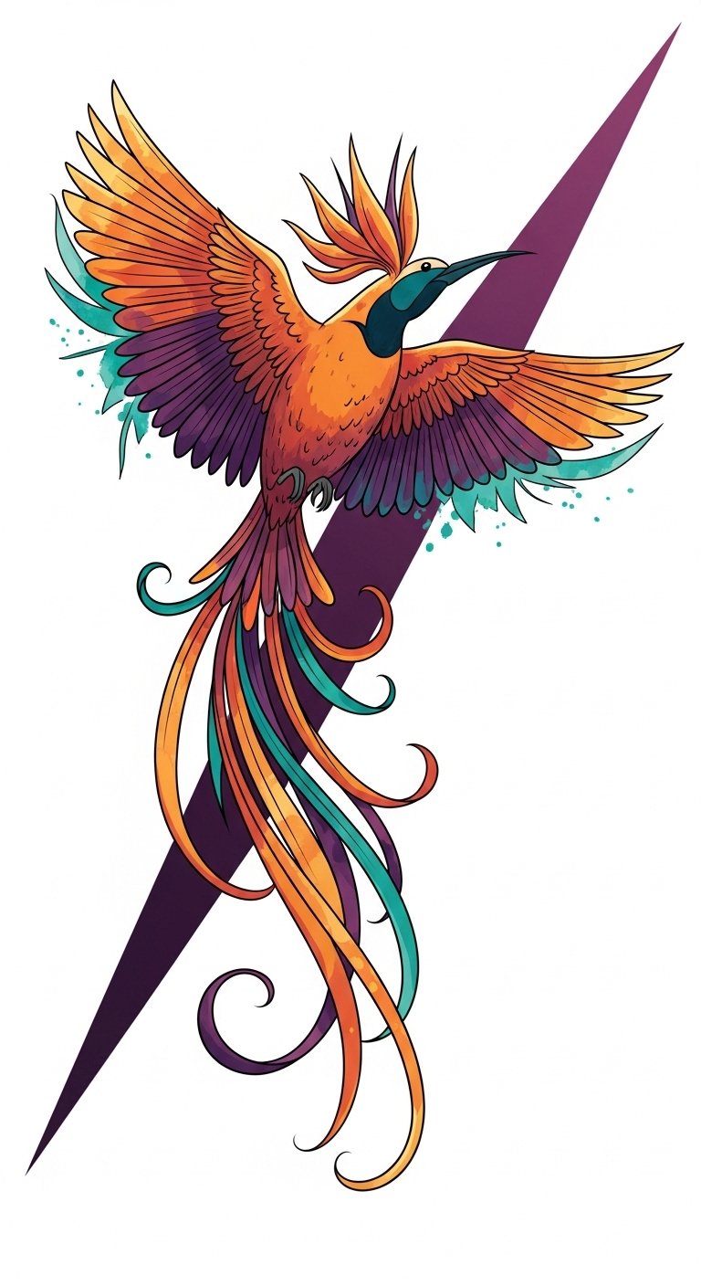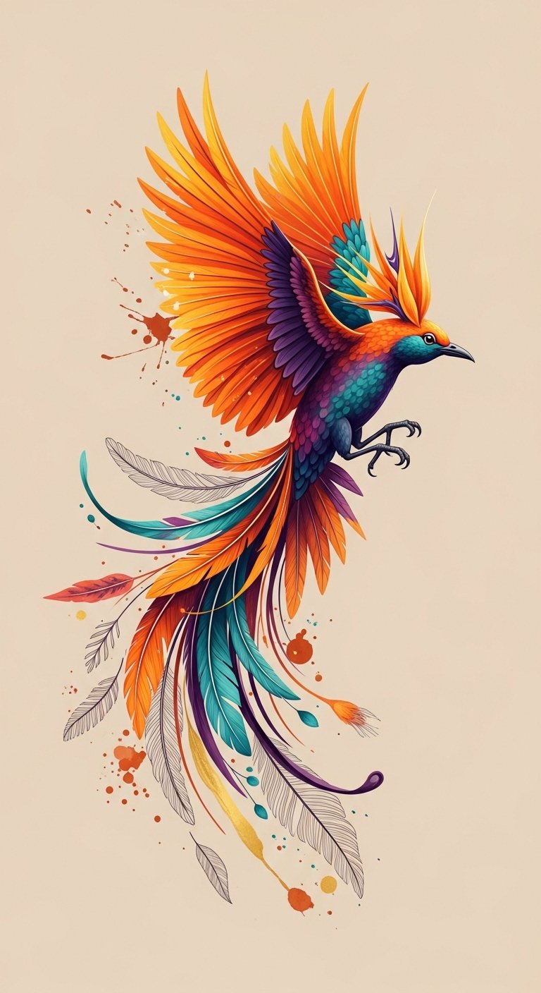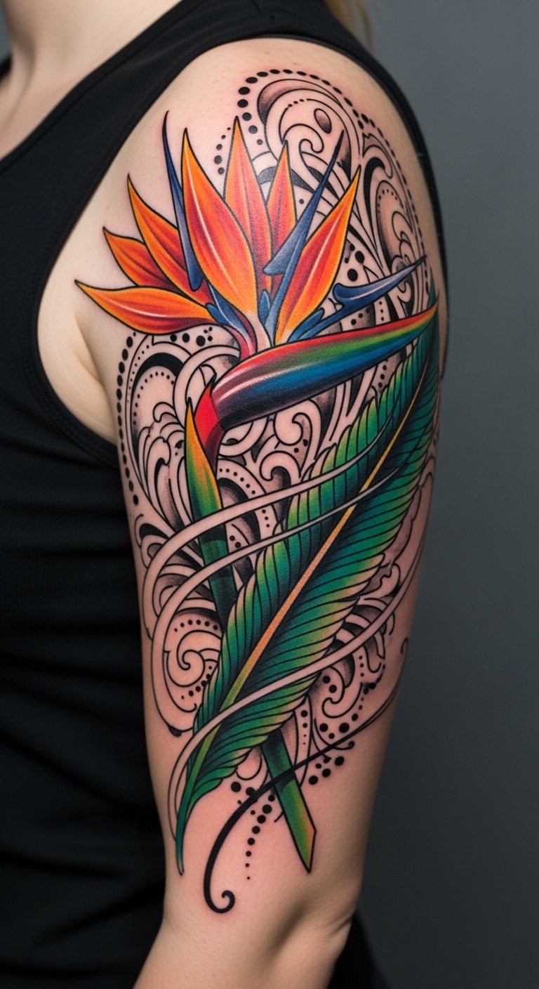 A flowing half-sleeve tattoo design that centers a stylized bird of paradise in mid-flight, its elongated plumes morphing into abstract floral and geometric motifs that reference multiple cultural art styles; vibrant but harmonious colors (deep orange, crimson, teal, gold) with fine-line detailing and subtle dotwork accents to evoke texture and light. Symbolically the composition emphasizes freedom and renewal through upward motion, beauty through lush color and intricate patterning, and joy through dynamic posture and warm tones; emotionally it should feel uplifting, empowering, and celebratory. Ideal placement: upper arm wrapping into the shoulder and slightly onto the chest or back for movement and visibility, or as a large thigh piece for personal expression and scale.