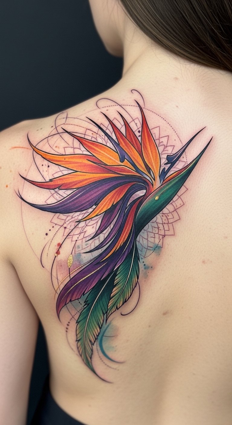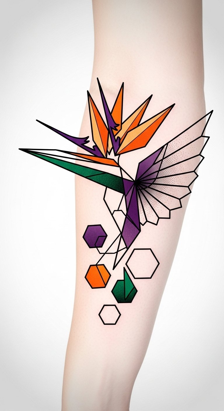 Building on the vibrant traditions of Bird of Paradise tattoos, geometric designs introduce a modern twist that captivates the eye with their sharp lines and structured forms.