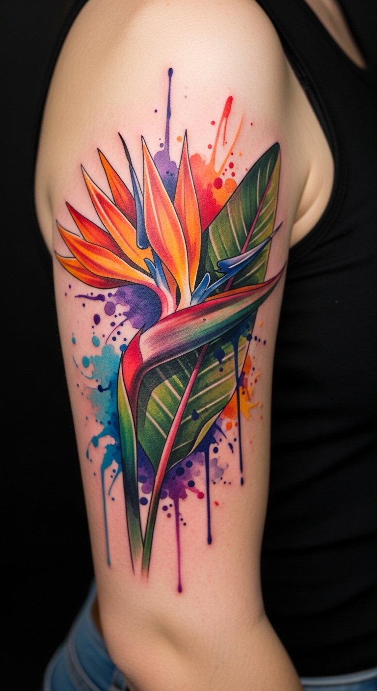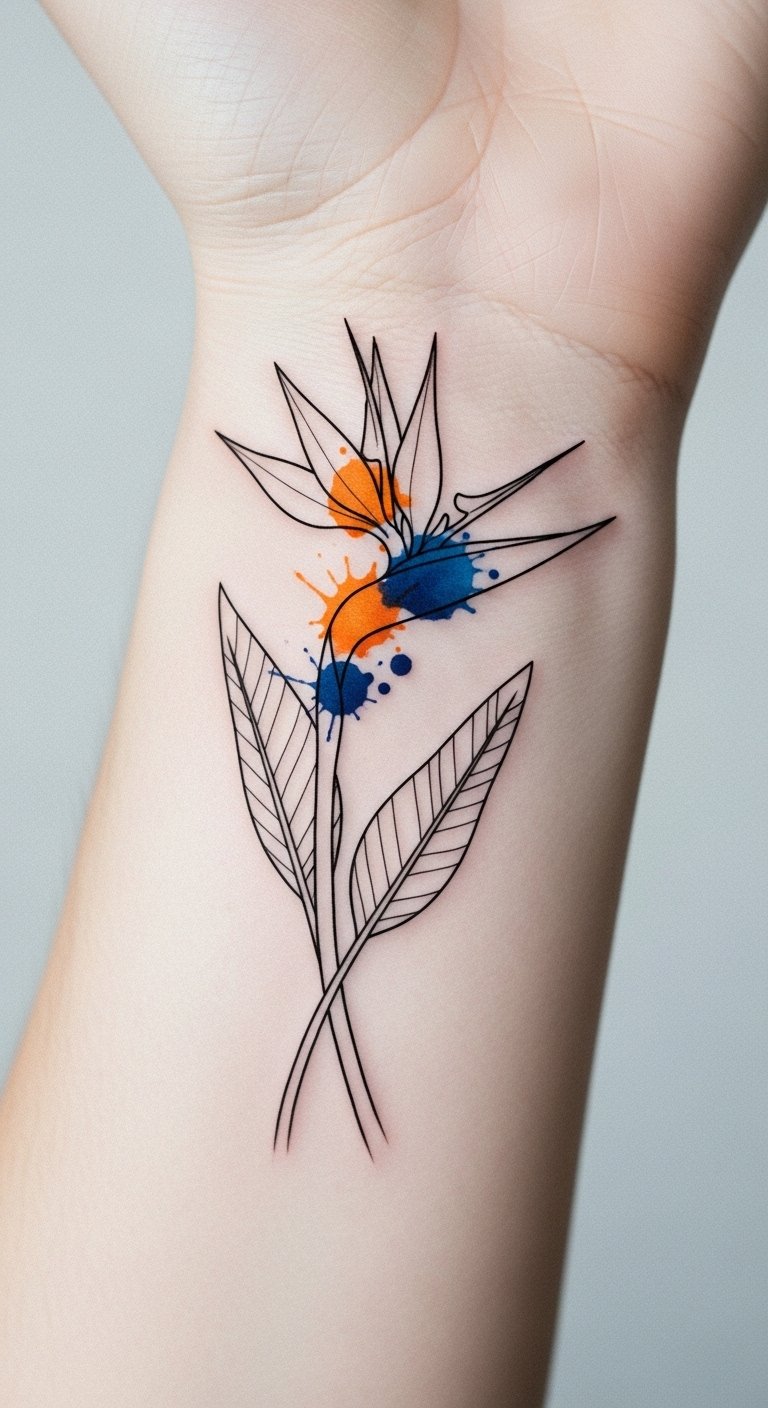 This tattoo concept uses the Bird of Paradise rendered in loose, layered watercolor washes—bright oranges, deep blues, and leafy greens bleeding into soft edges—accented by fine ink linework for gentle structure; placed along the outer forearm it curves with the musculature to read dynamically in motion, or scaled larger across the upper back it becomes a centerpiece that suggests liberation and self-expression; symbolically the flower represents joy, paradise, and resilience, evoking emotions of confidence and personal growth while the watercolor technique conveys fluidity and the uniqueness of the wearer.