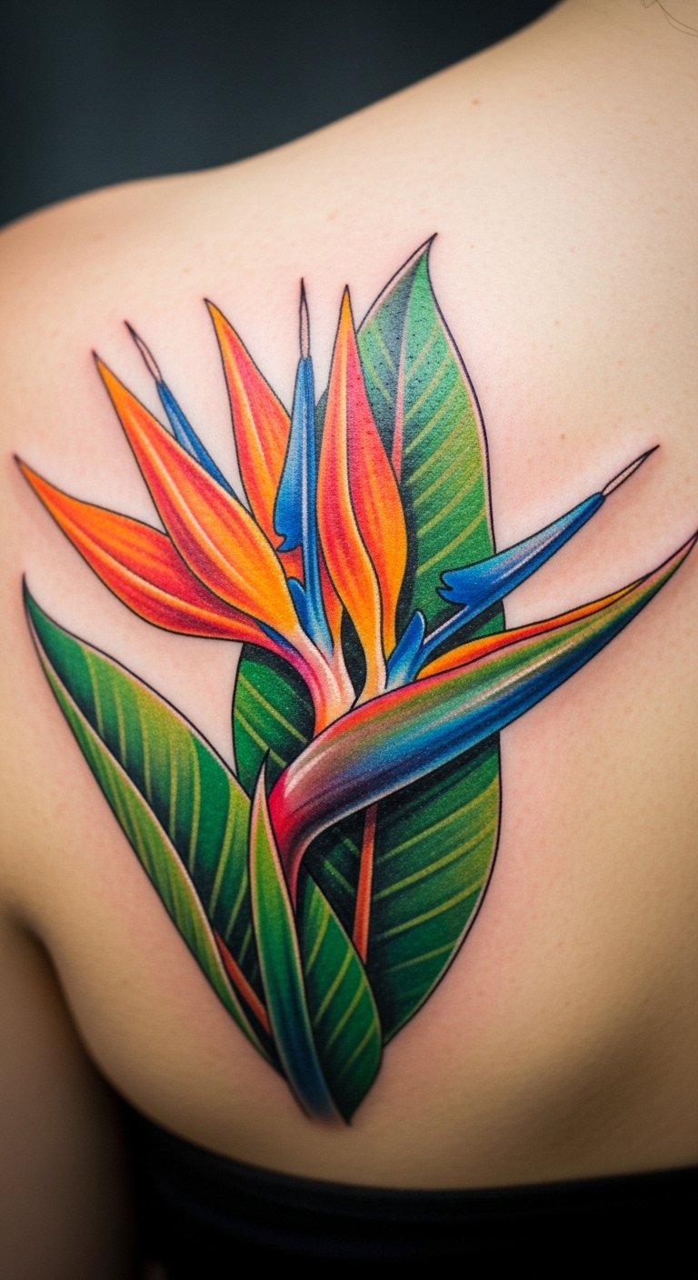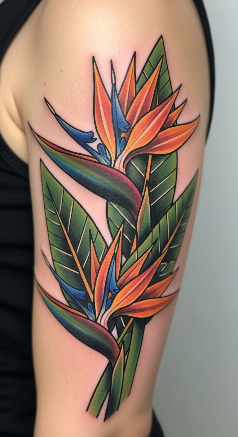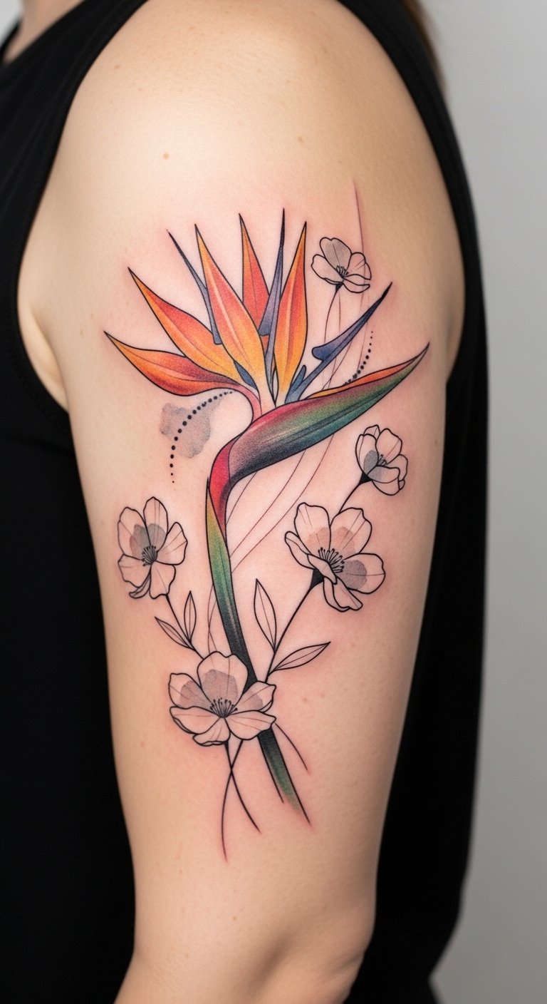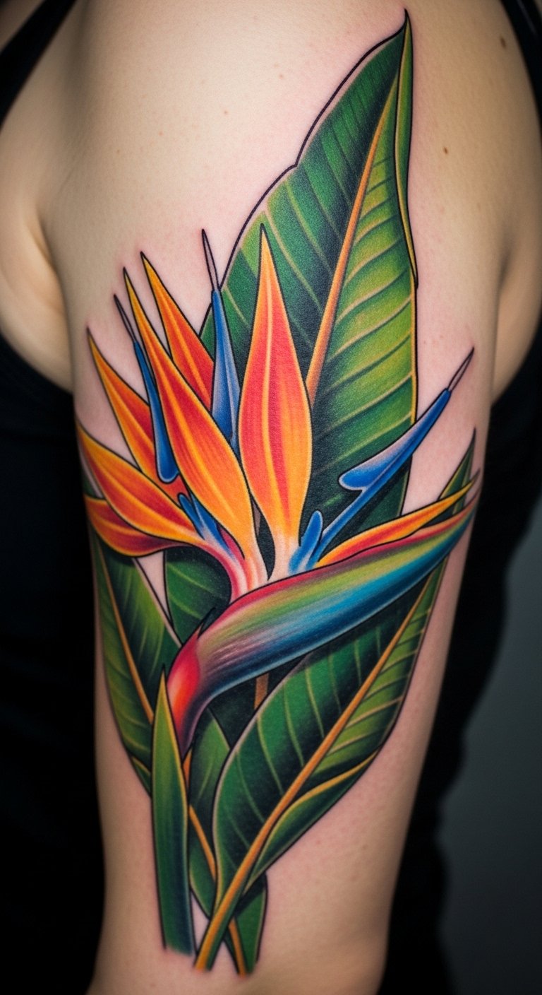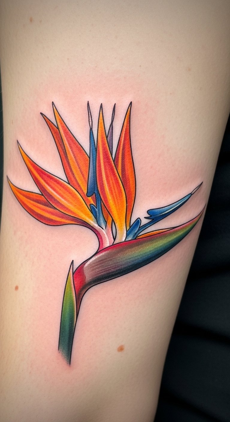 This design concept places a stylized bird of paradise bloom along the outer forearm or upper shoulder blade, using gradients of fiery orange transitioning to deep teal and electric cobalt, with leaf accents in emerald and lime; fine black linework defines the petals and feathers while soft watercolor washes add motion. Symbolically the flower represents joy, freedom, and personal rebirth, the vivid colors amplify feelings of courage and optimism, and the chosen placement lets the piece read as a statement of adventurous spirit—visible when you want to share it, yet easily covered—inviting both personal reflection and outward celebration.