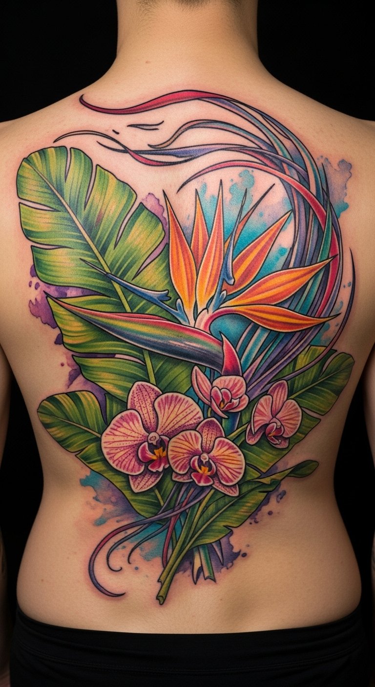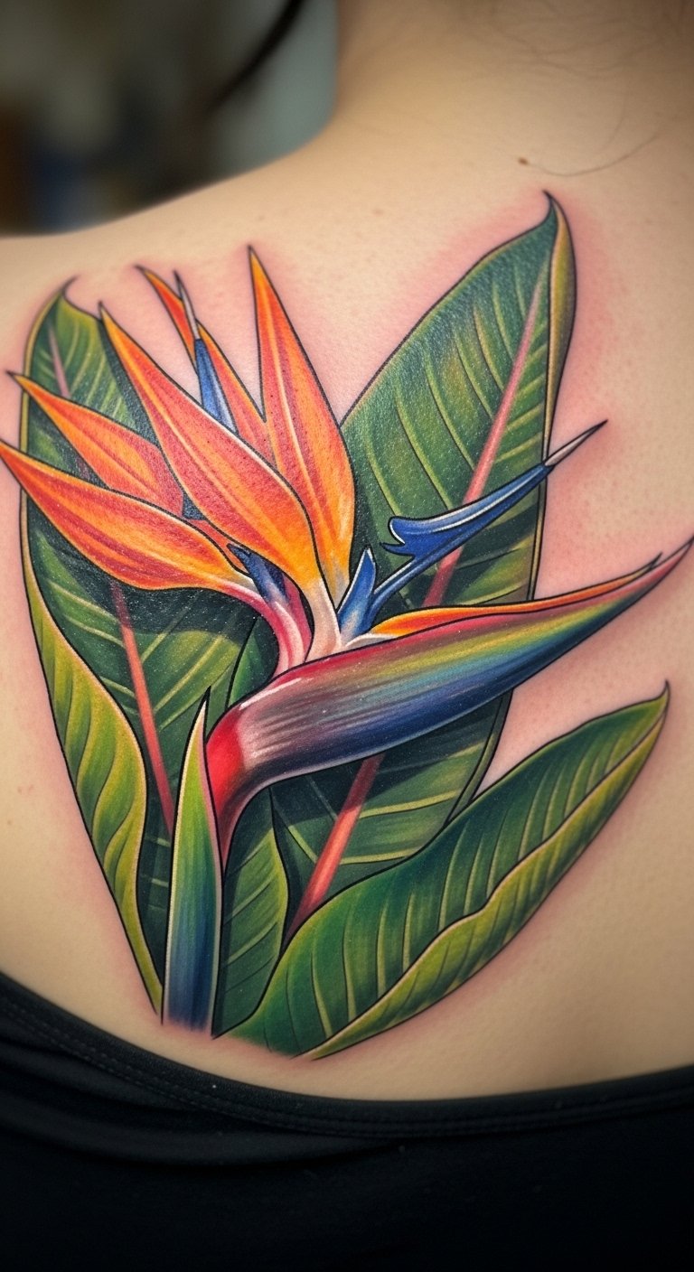 Large back tattoos featuring the Bird of Paradise are a breathtaking canvas that showcases the vibrant allure of this tropical bloom.