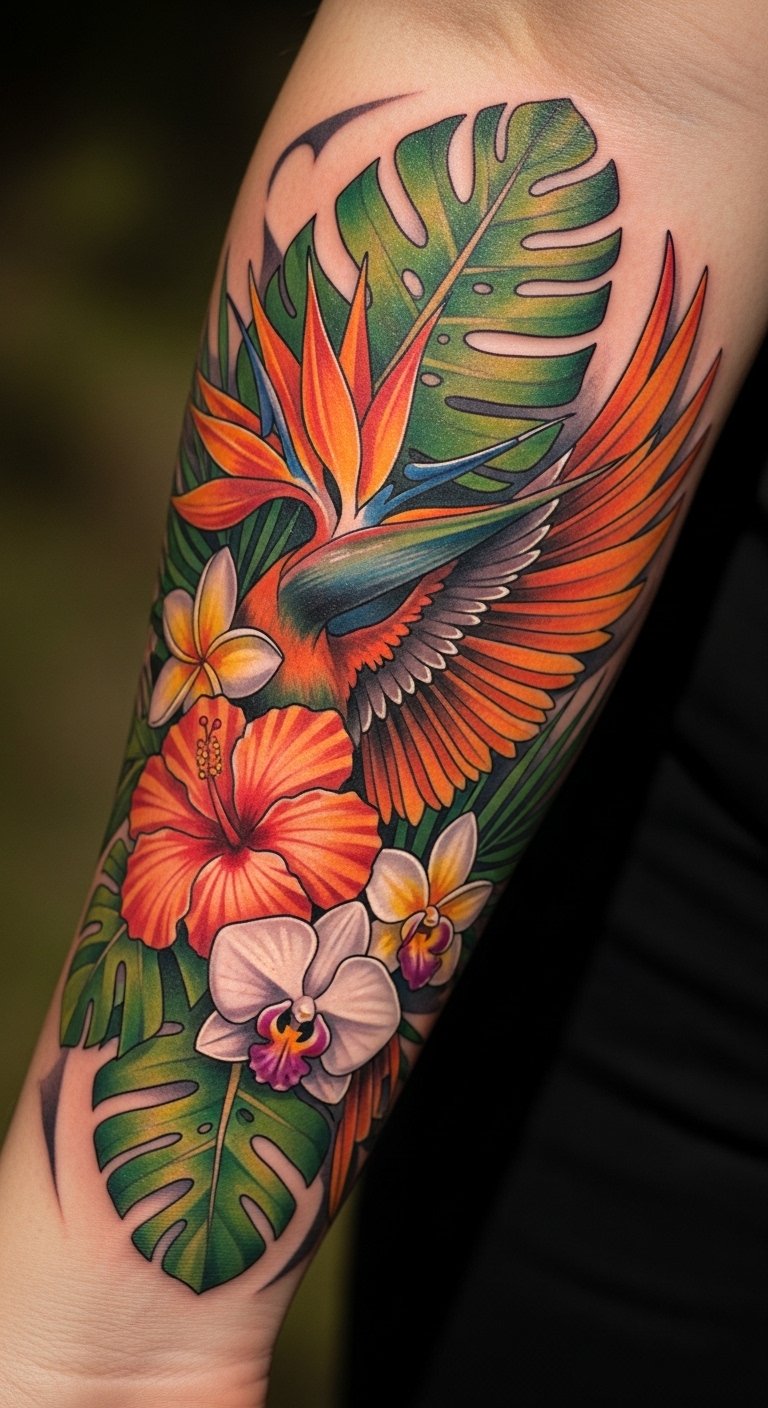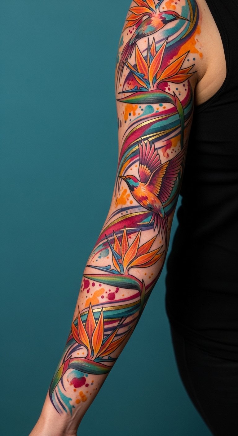 Each design embodies bird of paradise symbolism, representing joy, optimism, and adventure, inviting you to embrace your unique journey and express your wild soul. This placement emphasizes motion and visibility—shoulder-to-wrist flow suggests an unfolding personal story, the warm tropical palette evokes uplifting emotions, and the interplay of realistic detail with abstract color conveys both grounded identity and untamed spirit.
