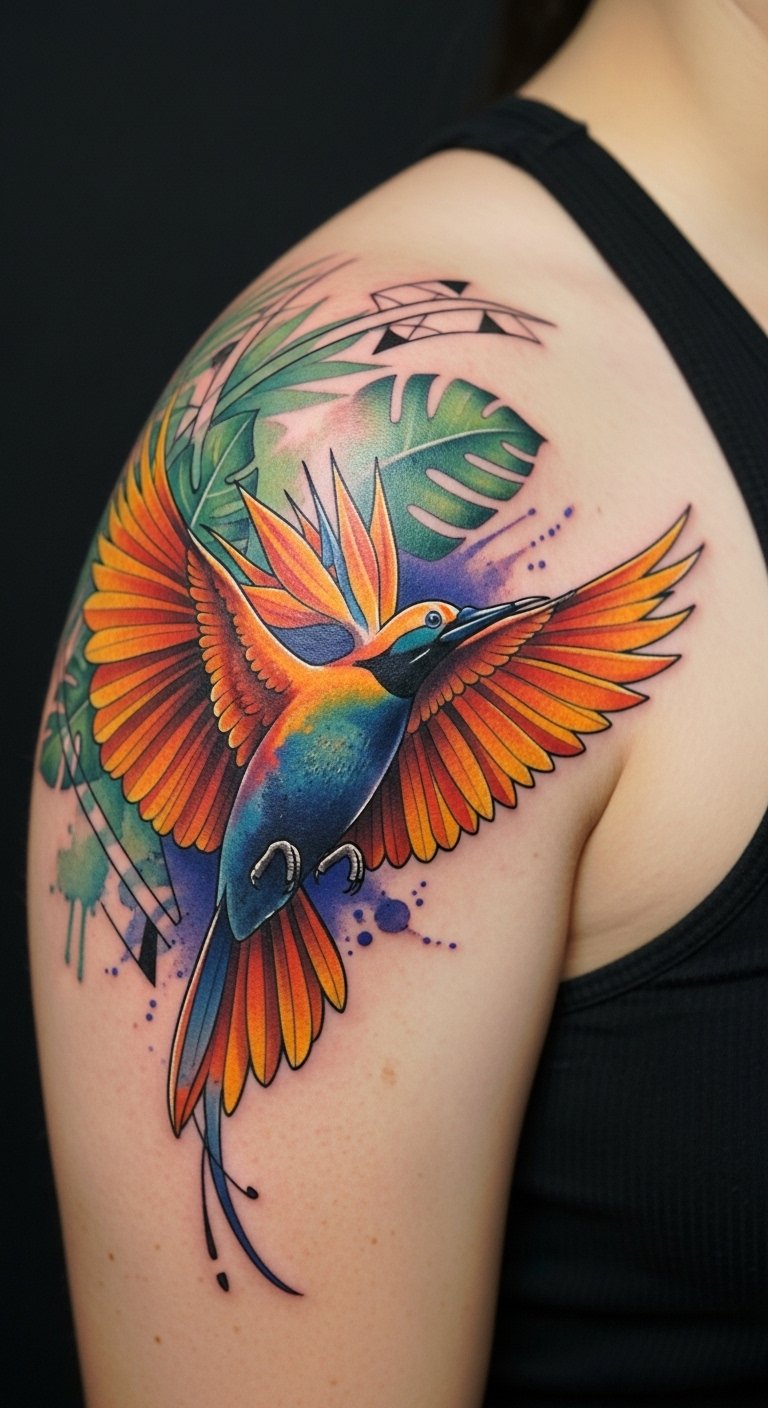Shoulder tattoos featuring the vibrant bird of paradise are a stunning way to celebrate your individuality and zest for life.