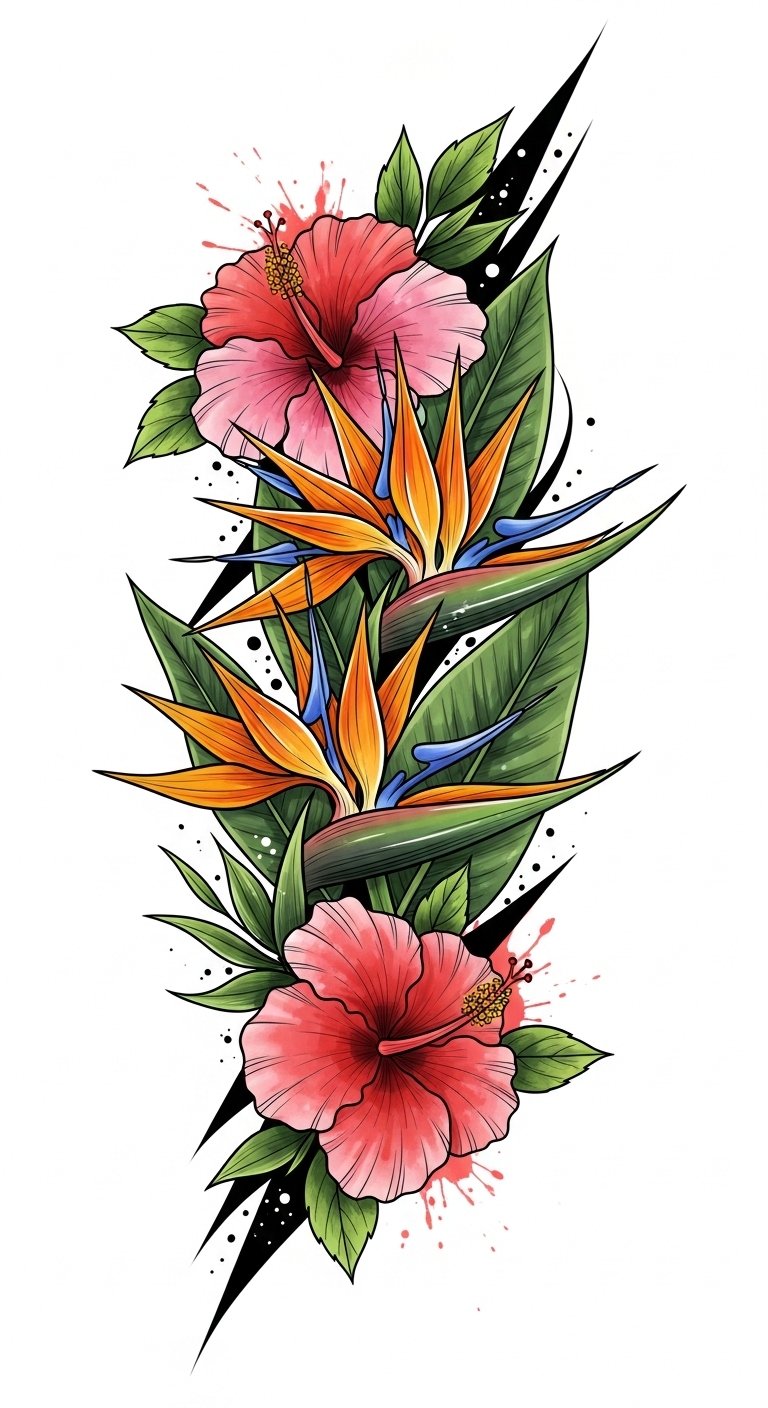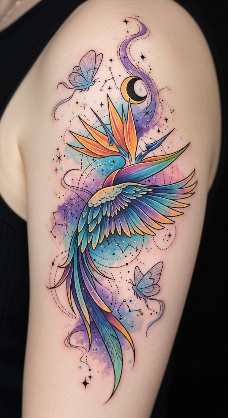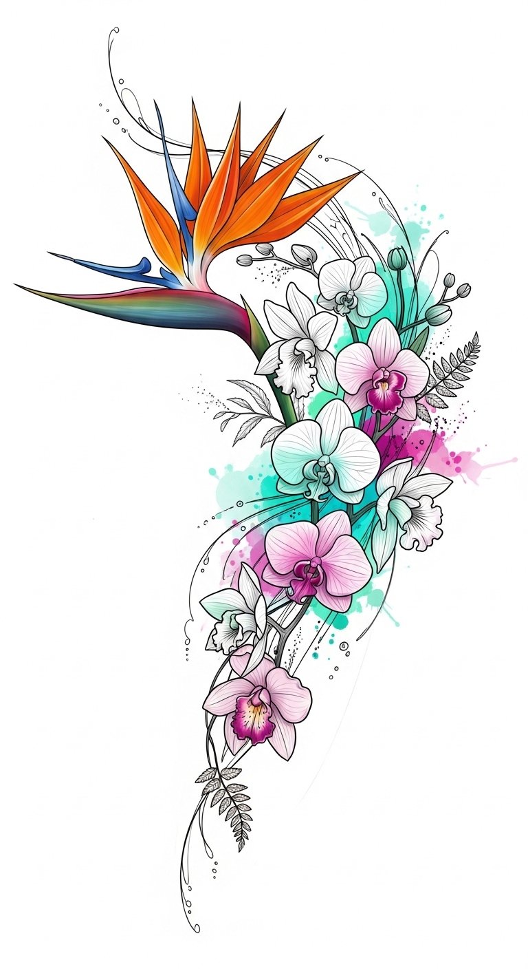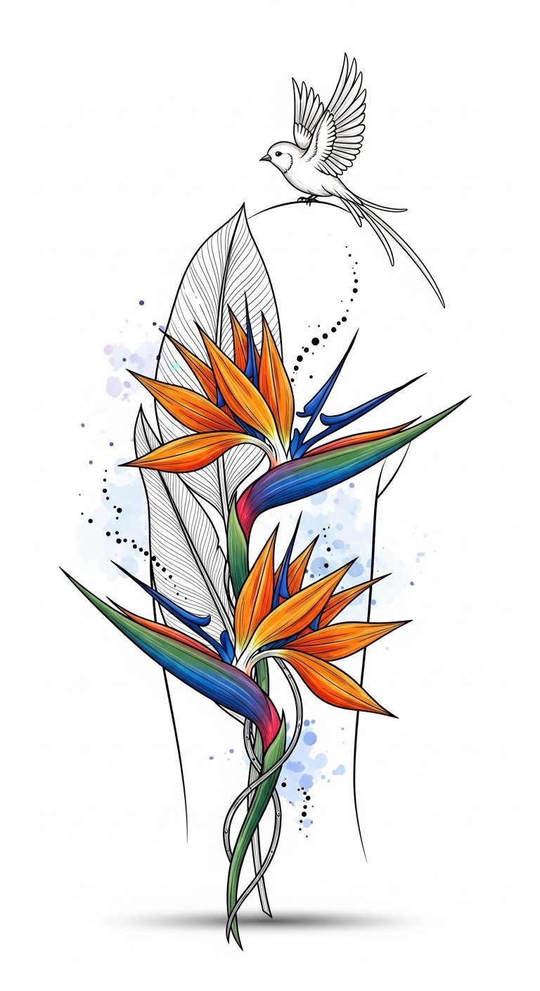 This design concept centers on a stylized bird of paradise rendered in vibrant tropical hues with flowing lines that suggest movement and freedom; symbolism emphasizes beauty, individuality, and joyful expression. Emotionally it should feel empowering and celebratory, tailored in scale to flatter the chosen placement—forearm or ribcage for visibility and personal resonance, shoulder blade or thigh for a more intimate, larger composition—and personalized elements (initials, favorite colors, or subtle motifs) integrated so the piece unmistakably reflects the wearer.