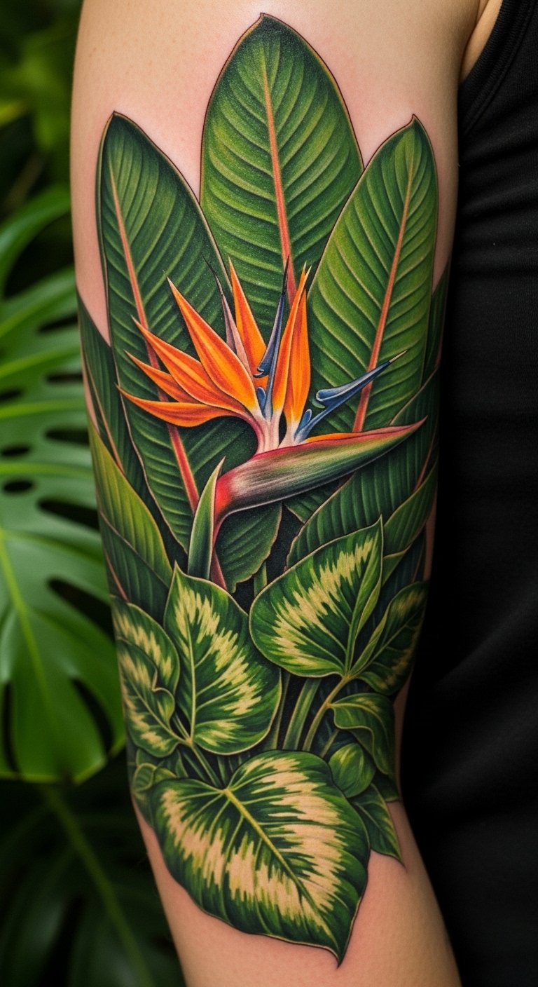 This design pairs a stylized bird of paradise in bold, saturated oranges and blues with cascading tropical foliage—banana leaves, monstera, and palm fronds—in layered deep and light greens to create depth; fine-line details and subtle white highlights add texture and a sense of movement, suitable for a shoulder-to-upper-arm wrap or a back piece that flows with body contours. Symbolically it speaks to freedom, personal growth, and a love of nature; emotionally it aims to inspire adventure and calm; placement on the shoulder, ribcage, or upper back accentuates the feeling of expansion and protects the composition so the foliage can envelop the bird naturally.