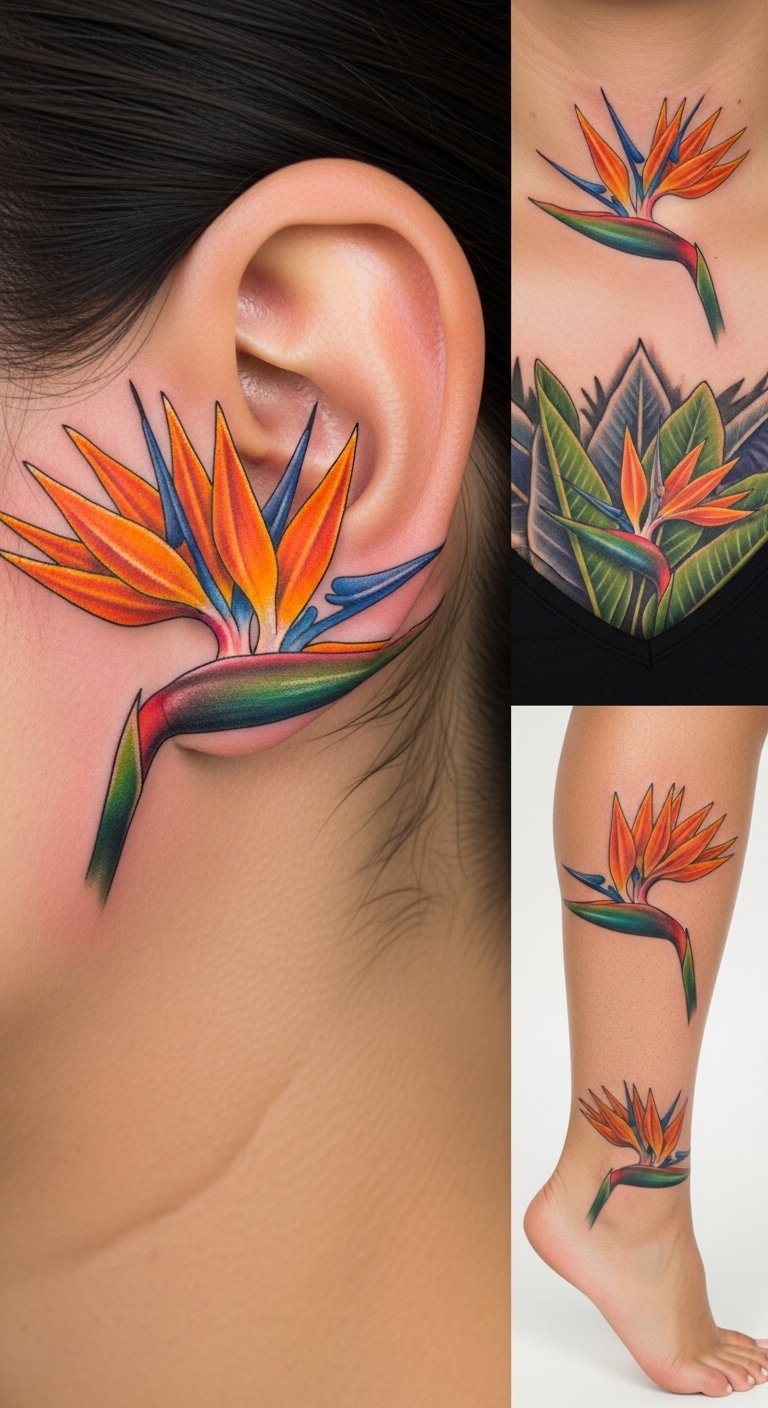 This design concept centers on the bird of paradise as a symbol of vibrant individuality and confident grace, to be inked in placements that match the wearer’s intent—subtle behind-the-ear or wrist tattoos for personal reminders of joy, a chest or collarbone piece for bold self-expression, ankle or nape locations for elegant accents, and inner thigh or side ribs when seeking a private, sensual statement;