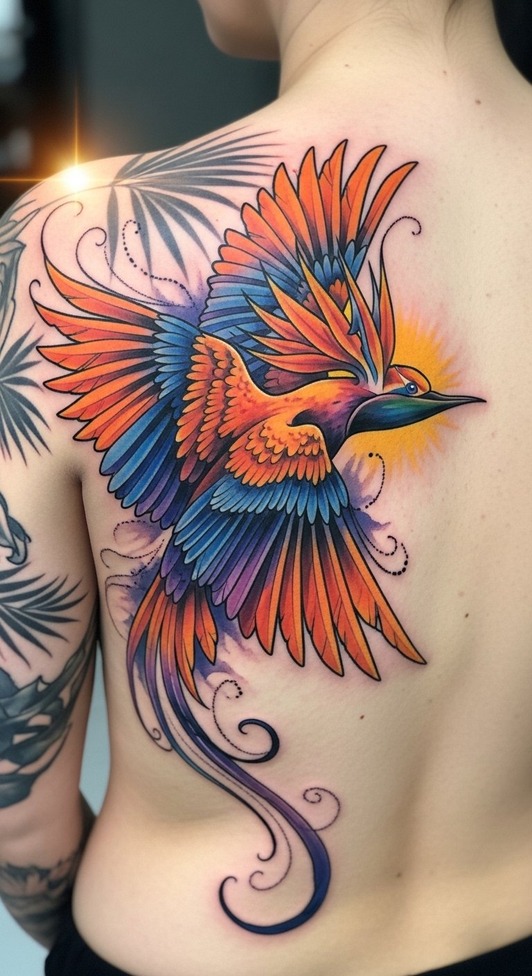 This design emphasizes liberation and exuberance through expansive motion and luminous color, evoking uplift and celebration; oversized placement across the back and ribcage enhances the sense of flight and allows for detailed feather work, while the watercolor elements soften the composition to express tenderness and joy.
