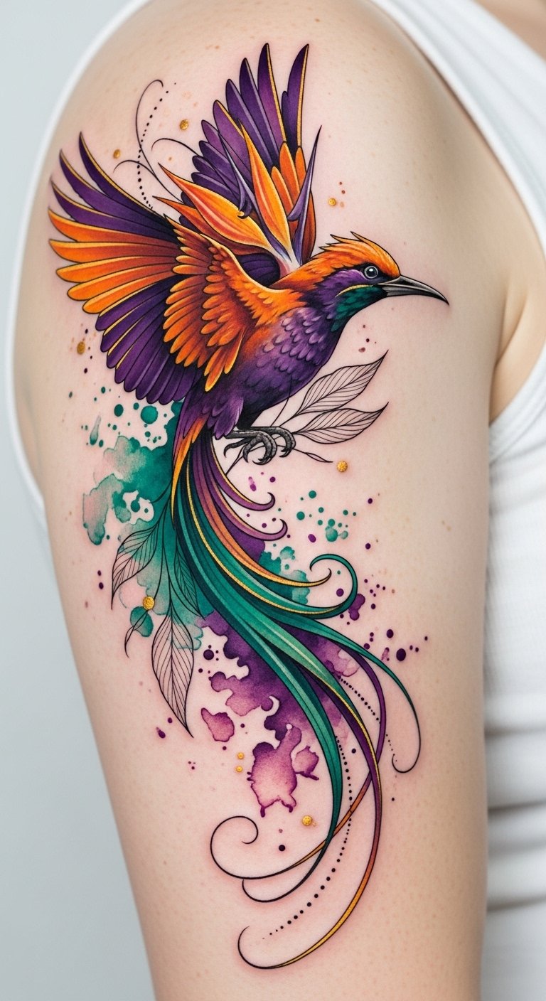 This placement and composition emphasize upward movement and openness—perfect for the upper arm wrapping toward the shoulder blade to suggest flight and expansion. The color choices and watercolor accents convey exuberance and warmth, while fine-line details and dotwork add intimacy and resilience; emotionally it represents joyful freedom balanced by enduring love and inner strength, suitable for someone seeking a bold yet elegant personal emblem.