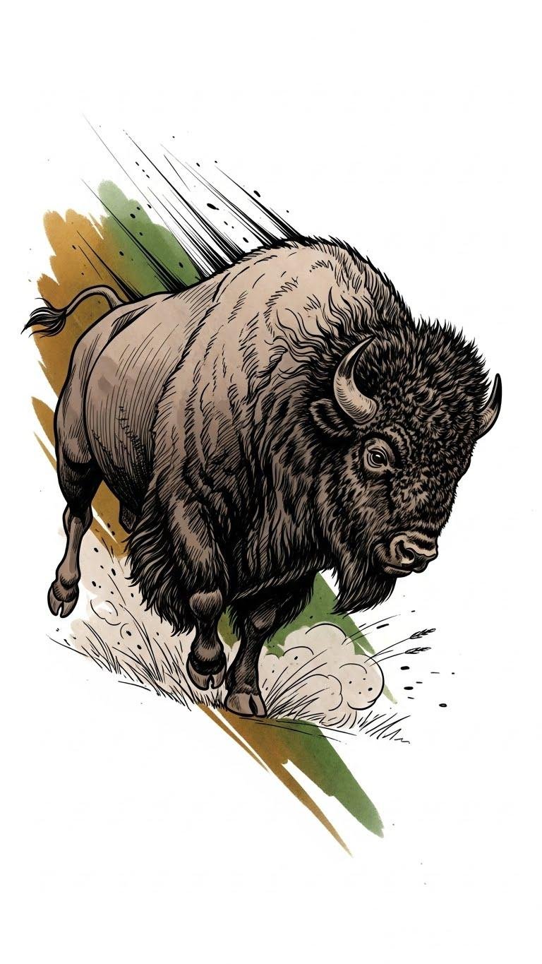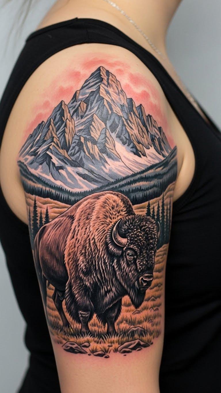 When you think about bison tattoos, what comes to mind? These powerful symbols of strength and resilience can transform your skin into a canvas of bold self-expression. From realistic portraits that capture every detail to vibrant watercolor designs that burst with color, each tattoo tells a story. Imagine the significance behind a bison silhouette or a striking geometric pattern. Which design speaks to your inner spirit? Let’s explore the stunning options that await you. The concept blends realism and painterly abstraction to evoke grounded strength and emotional freedom; placed on the forearm it reads outward as a personal emblem, on the upper back it becomes a protective presence—symbolizing endurance, community (the silhouetted herd), and the balance between raw power and inner calm represented by the color wash and geometric lines.
