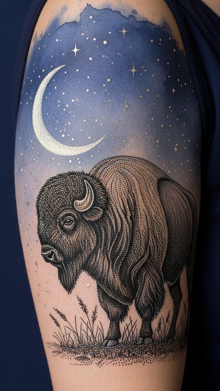 A bison and moon tattoo captures the enchanting interplay between strength and serenity, merging the raw power of the bison with the ethereal beauty of the moonlit sky.