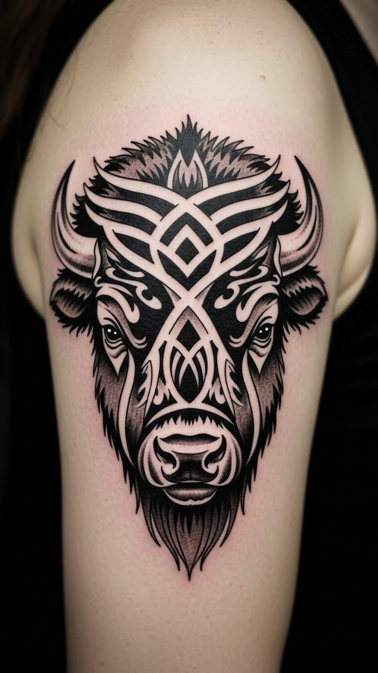 This design weaves bold black tribal lines into the bison’s silhouette, combining flowing curves and sharp geometric motifs to evoke strength, resilience, and communal ties; place on the upper arm or back for a statement piece that follows muscle contours, or scale down for forearm or chest to keep personal connection close.
