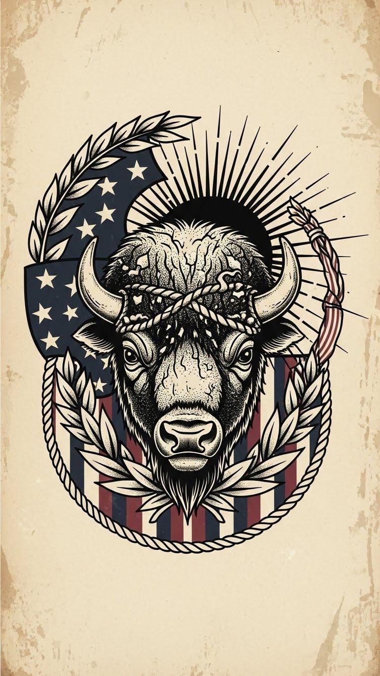 The imagery—sunburst rays and laurel wreath framing the bison—symbolizes glory, endurance, and honor; stars and stripes accents tie to national identity while the distressed texture adds wistful nostalgia.