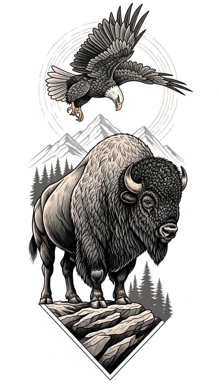 The bison symbolizes resilience and grounding, while the eagle signifies soaring ambition and liberation. Together, they create an emblem of balance, capturing your desire for independence and connection to nature—a vivid reminder of your wild spirit and unyielding strength.