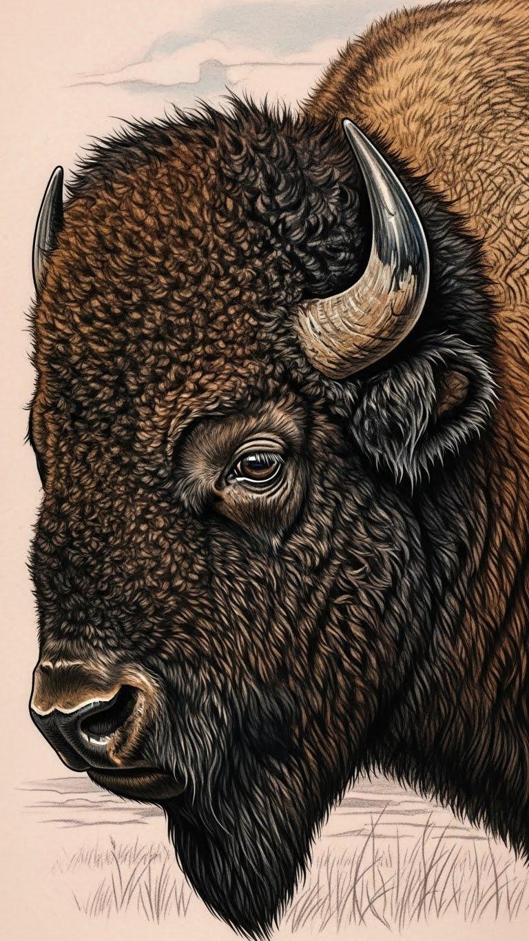 A realistic bison portrait captures the raw power and majestic presence of this iconic animal, drawing you into a world where strength and resilience reign supreme. Each stroke reflects bison symbolism meanings, embodying freedom and endurance.