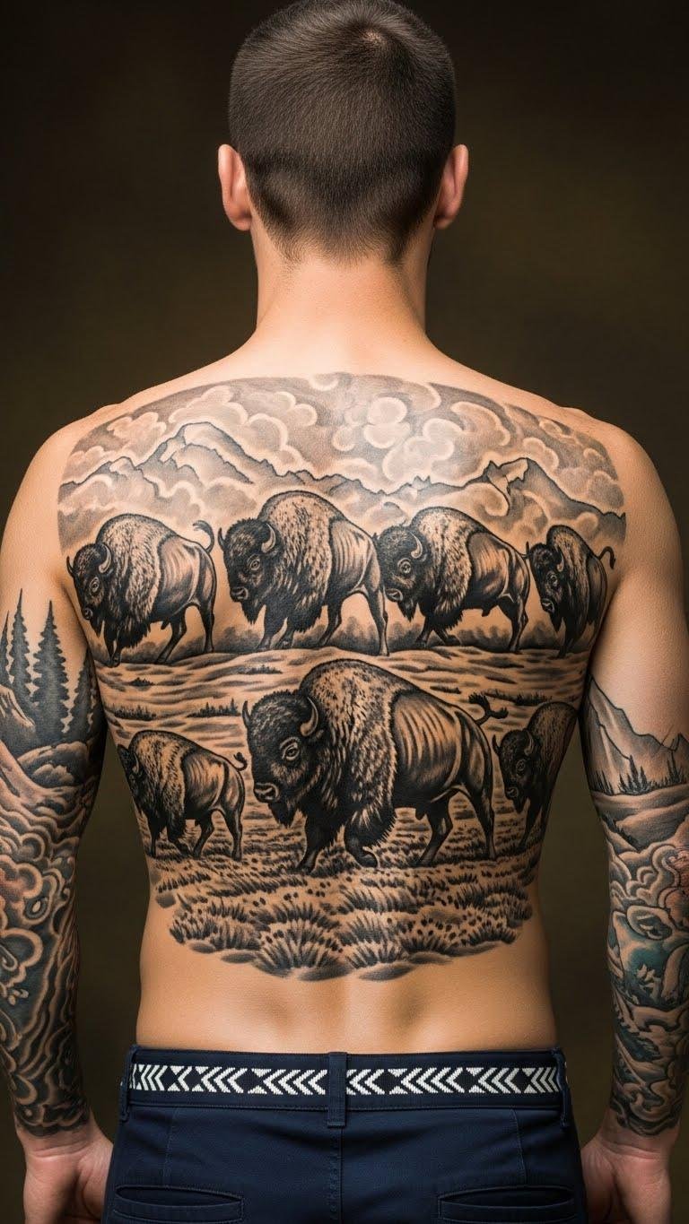 This design covers the entire back in a panoramic composition: layered plains and distant mesas form a subtle backdrop while overlapping bison silhouettes create movement from one shoulder blade down toward the lower back.