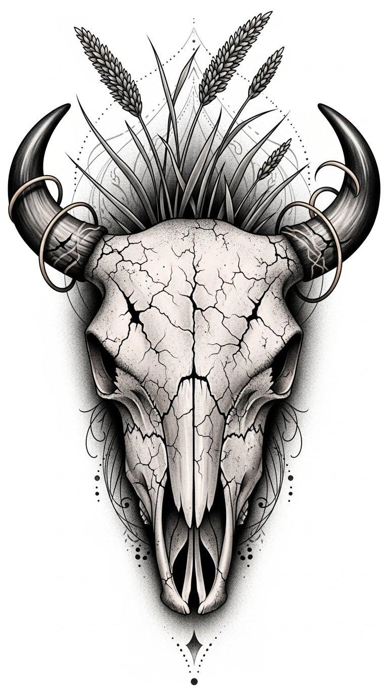 A detailed bison skull tattoo carries a striking blend of artistry and symbolism, serving as a powerful reminder of the creature’s enduring spirit and the balance between life and death.