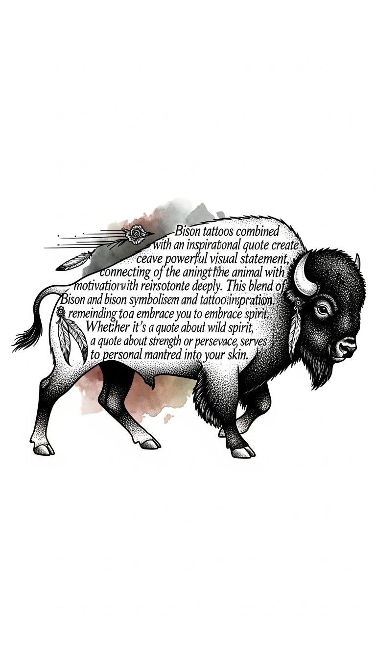 The design pairs bold animal imagery with flowing text to create a wearable statement: the bison conveys strength, endurance, and freedom while the embedded original text acts as a continual reminder and personal mantra. Emotionally it balances raw power with intimate reflection; visually, linework and dot shading emphasize texture and movement, while the watercolor background softens the composition. Ideal placements are the upper arm for visibility and wrap, the chest for proximity to the heart, or the back for a larger, more dramatic canvas where the quote can follow the bison’s natural contours.