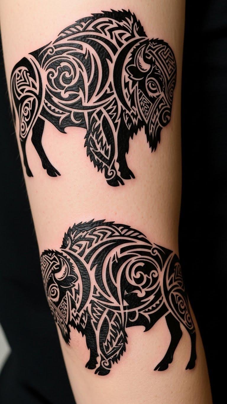 Exploring the world of bison tattoos, tribal styles stand out for their bold designs and deep symbolism.