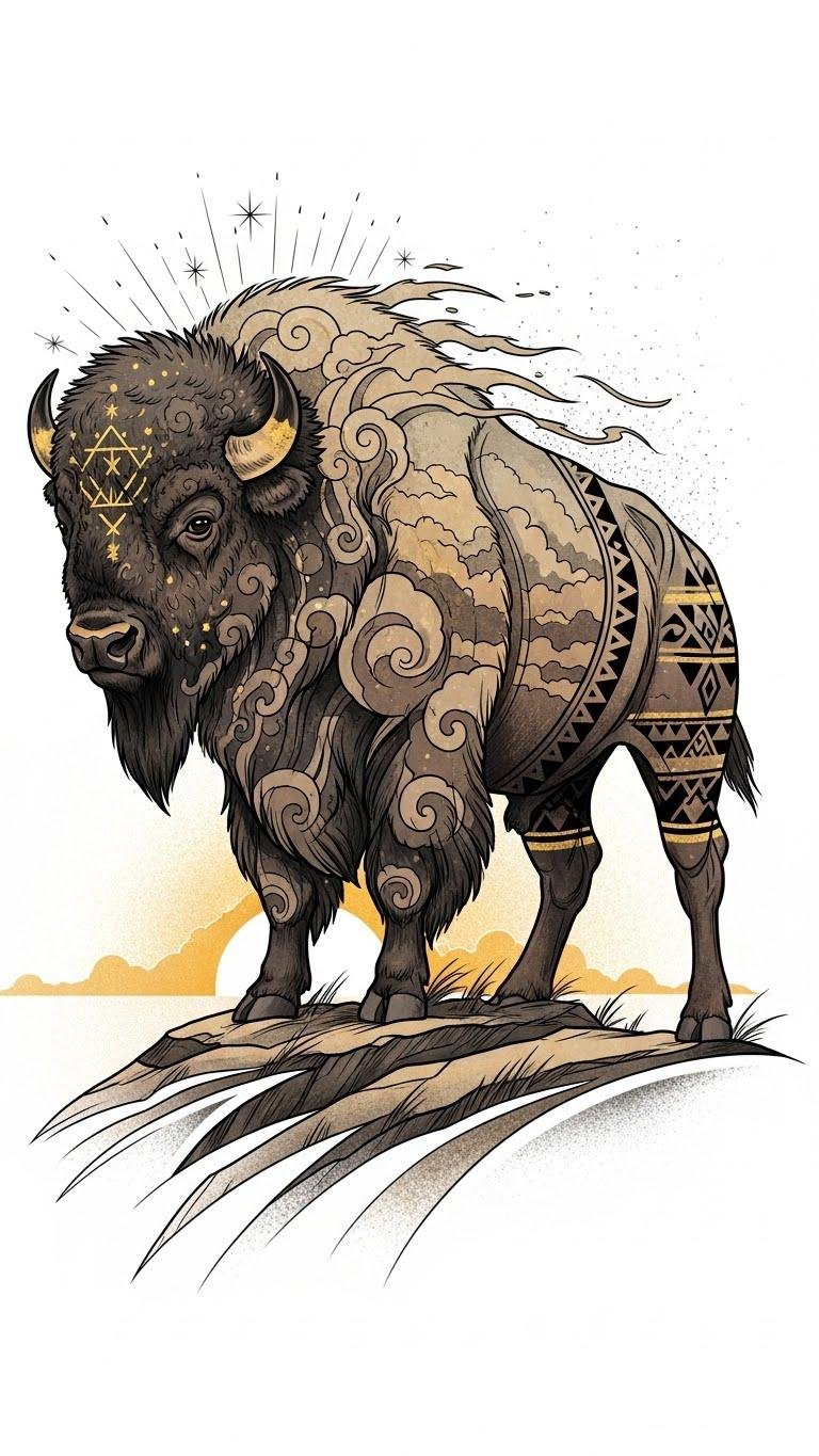 This design beautifully illustrates bison symbolism meanings, representing resilience and freedom, while the moon adds a mystical layer with its lunar connection.