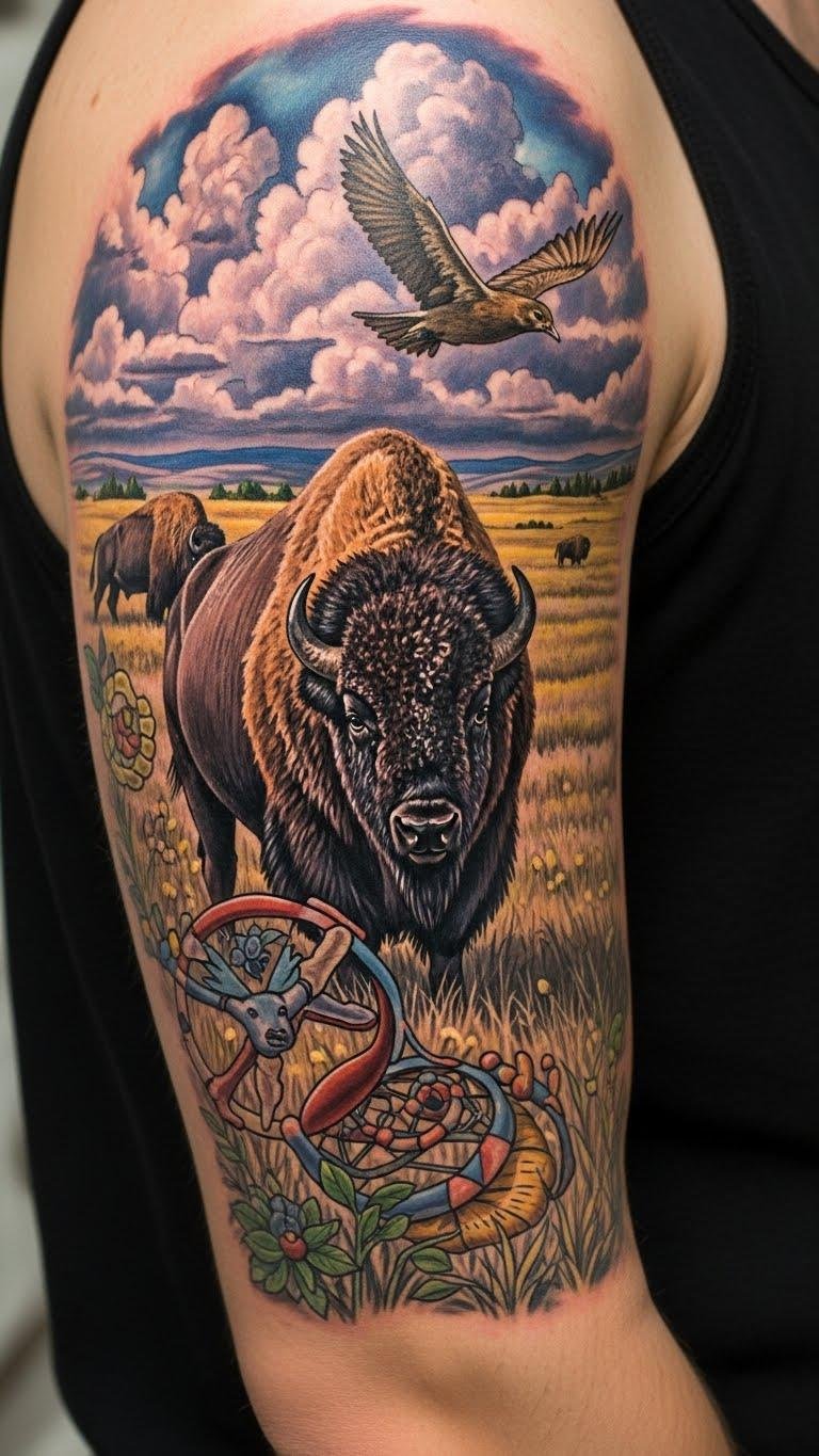 This tattoo also honors bison conservation significance, reminding you of the journey from near extinction to resurgence, celebrating nature’s beauty and the spirit of survival.