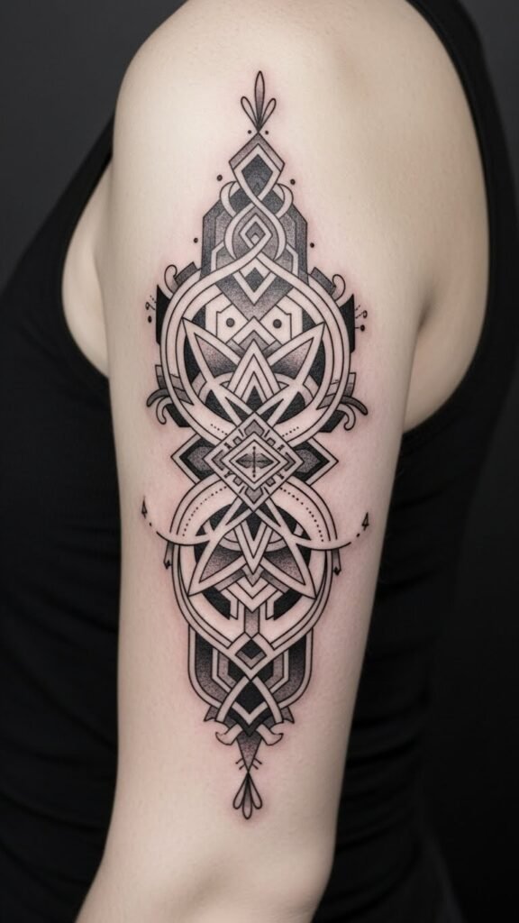 A forearm-to-shoulder tattoo layout that centers the described text inside a perfect circle, surrounded by concentric rings of interlocking triangles, mandala petals, and crisp dotwork; fine-line symmetry radiates outward into geometric bands that follow muscle contours, allowing movement to animate the design. Symbolically, the central sphere and balanced elements represent unity, precision, and the wearer’s pursuit of personal harmony; emotionally it conveys calm confidence and liberated self-expression. Best placed on a limb or torso where the natural curvature enhances the circular focal point and lets the symmetrical patterns breathe with the body.