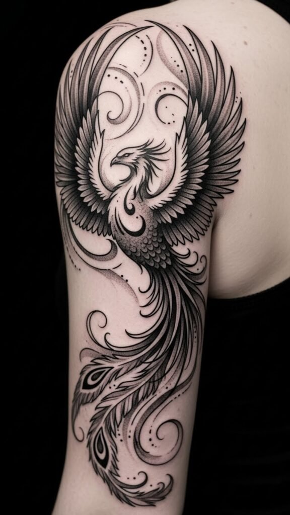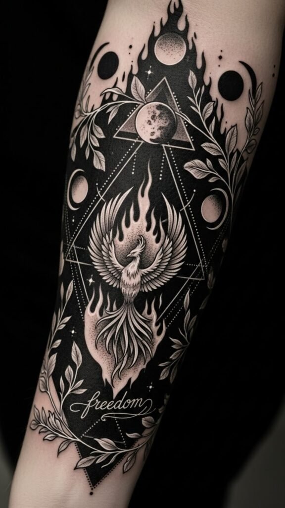 With bold tattoo symbolism and enchanting monochrome art, these contrasting styles redefine tattoo trends, celebrating freedom through fearless expression. The design’s symbolism blends rebirth (phoenix), resilience (matte black field), and growth (botanical vines), evoking a bold, introspective emotion; ideal placement is the forearm where wraparound composition and visible contrast emphasize personal empowerment and daily remembrance.
