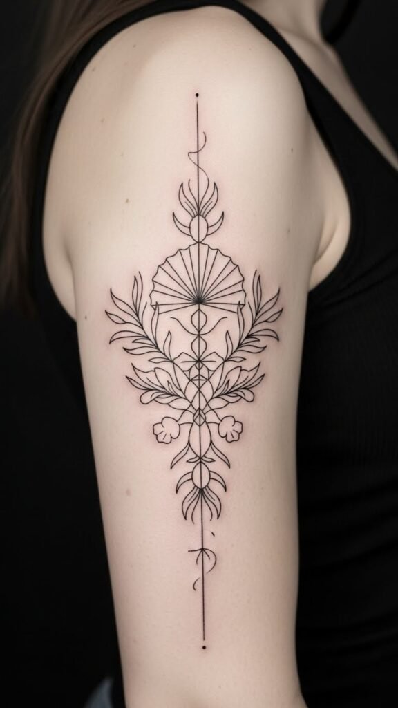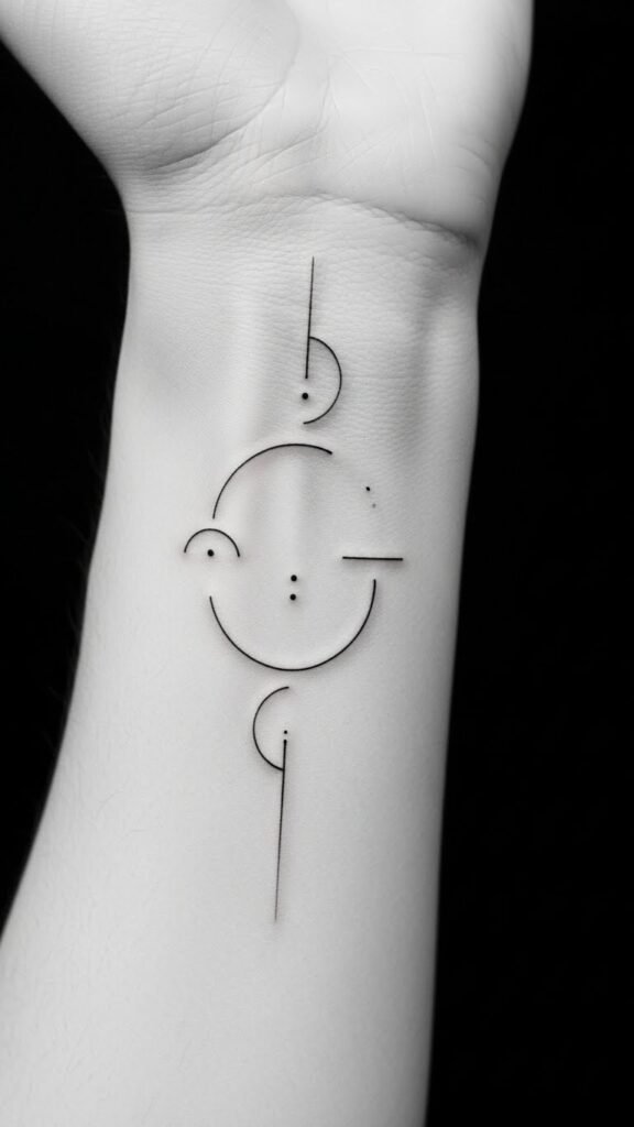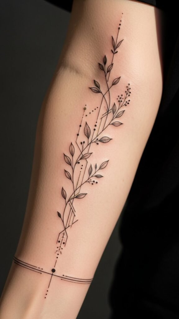 A slender wrist or along the inner forearm, the design merges a single continuous fine line that transforms into tiny botanical elements and geometric accents, echoing the original text’s focus on precision and minimalism; the symbolism speaks to personal growth and clarity—delicate leaves represent resilience, geometric shapes signify balance, and the airy spacing conveys openness and freedom; emotionally it aims to feel calming, confident, and quietly expressive, and placement on the wrist or inner forearm keeps it intimate yet visible, a daily reminder of refined artistry and self-expression.