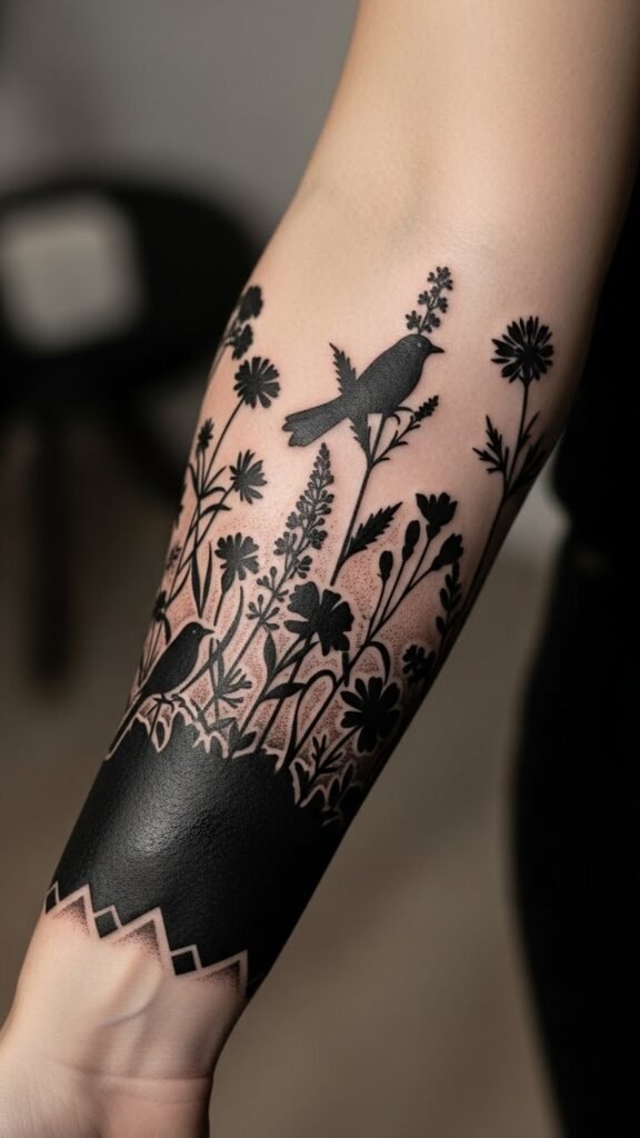 The blackout symbolism resonates deeply, transforming your skin into a personal manifesto, where each darkened inch celebrates your unapologetic spirit and unique journey. The design uses the starkness of solid black to convey strength and reclamation, while the emerging negative-space wildflowers and birds introduce hints of vulnerability, growth, and liberation.