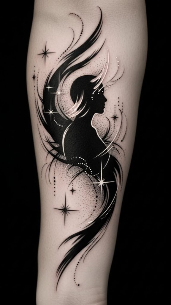 Each piece serves as a canvas for artistic expression, reflecting your unique story while embracing the freedom to explore your personal style. The design uses the central silhouette as the self or inner identity, the surrounding brushstrokes and stars as life’s movement and aspirations, and the white filigree to signify delicate hope; emotionally it balances strength and vulnerability, ideal for a forearm to display personal narrative or along the ribcage for a more intimate, contemplative placement.