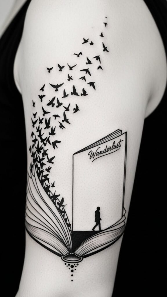 Whether it’s a tribute to a loved one or a reminder of your journey, these tattoos become part of your identity, celebrating freedom and the stories that shape who you are. The open book symbolizes life’s chapters and personal history, the birds represent release and transformation, and the lone figure walking the spine evokes the ongoing journey.
