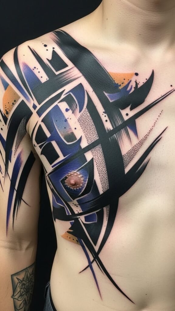 These contemporary interpretations invite you to break free, celebrating individuality and creativity, transforming your body into a striking masterpiece of freedom and self-expression. The design symbolizes the tension between control and spontaneity—structured geometric fragments anchored by fluid brushstrokes—evoking liberation, resilience, and contemplative energy; emotionally it reads as both bold and introspective.