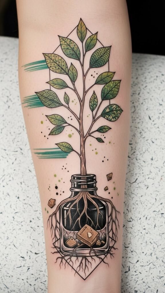 By choosing ethical tattooing and supporting green initiatives, you not only express your individuality but also contribute to nature conservation while minimizing environmental impact. The sapling symbolizes growth, renewal, and personal commitment to the planet; the ink bottle of recycled glass and biodegradable fragments emphasize ethical choices and reduced waste.
