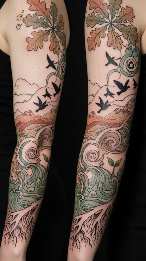 This design symbolizes interconnected ecosystems and personal stewardship—oak roots for grounding, waves and mountains for resilience, migrating birds for hope and movement toward change. Emotionally it evokes reverence and responsibility; ideal placement is a full or half sleeve to allow the narrative to flow with the arm’s contours, or the side torso for a larger landscape feel.
