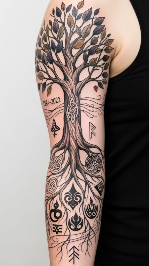 Celebrate your freedom and heritage with tattoos that resonate deeply within your spirit. The design’s ancestral tree anchors emotion and lineage, roots morphing into culturally distinct motifs symbolize interconnected heritage; wind lines suggest continuity and movement of stories through time.