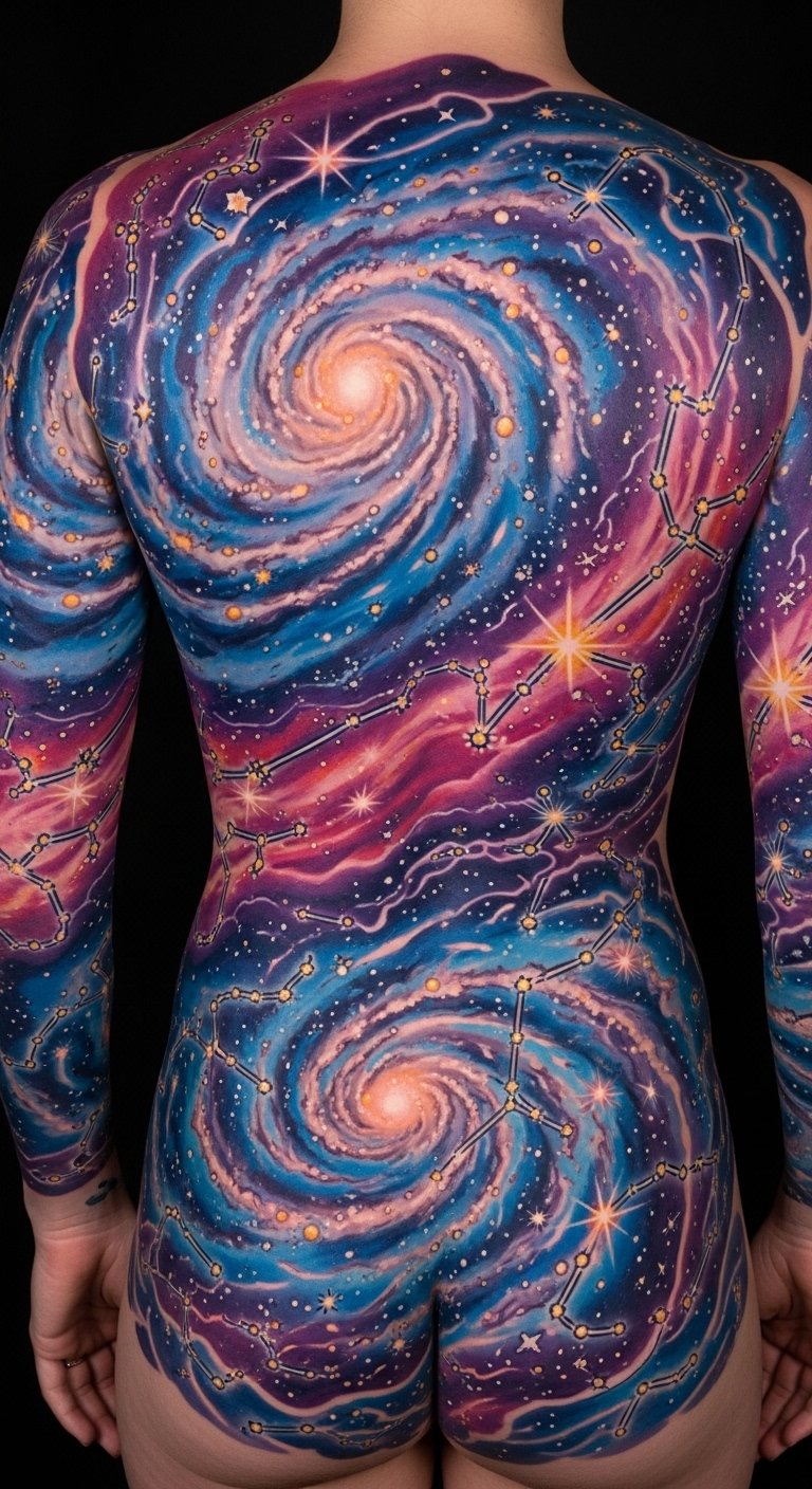 This design concept translates the original text into a tattoo: a dynamic forearm or upper back piece featuring vibrant galaxy swirls in deep indigo, teal, magenta, and gold, woven with fine-line constellations and subtle white star dots; watercolor gradients, soft nebula clouds, and crisp inked strokes create movement and depth. Symbolically it represents exploration, wonder, and personal storytelling—each swirl marks a chapter of one’s life while constellations signify guidance and connection. Emotionally it evokes awe, freedom, and a contemplative calm; ideal placements include the forearm for visibility, the shoulder blade for a private statement, or along the ribcage for a more intimate canvas.