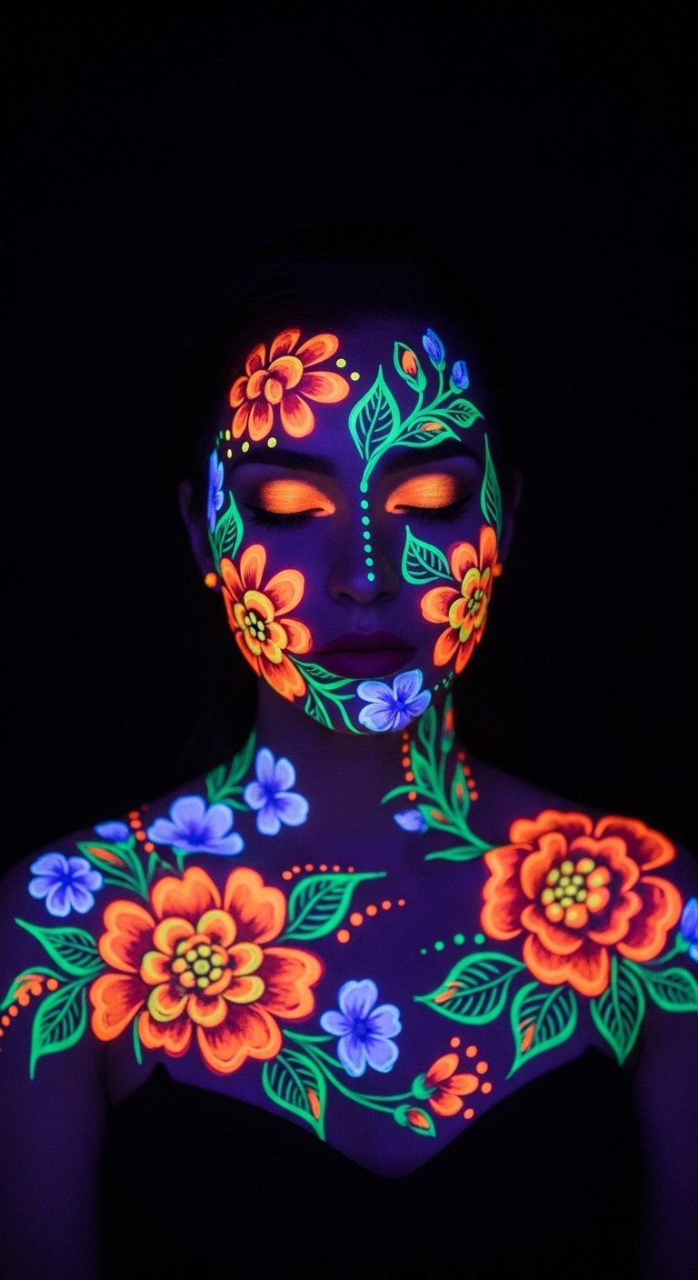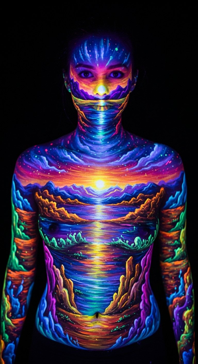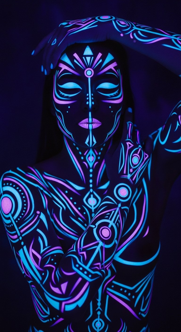 You can adorn your skin with vibrant, carefree designs that dance under black light, creating an enchanting spectacle. These delightful playful doodles and whimsical patterns invite spontaneity, turning your body into a canvas of joy and freedom, ready to shine in the night.