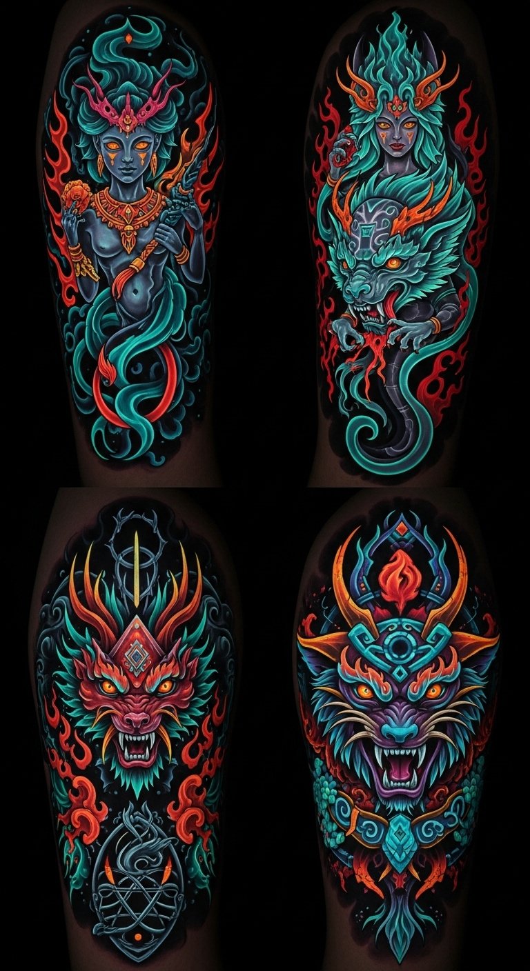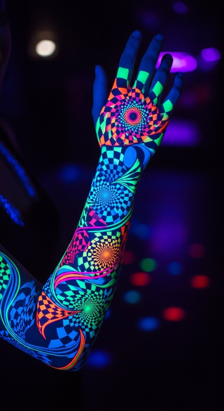 Ideal placement: forearm or lateral rib for a vertical composition that curves with muscle movement, with the UV elements concentrated where light will accentuate contours (edges of shoulder, along collarbone, or calf) so the piece alternates between subtle daylight elegance and vibrant nocturnal revelation.