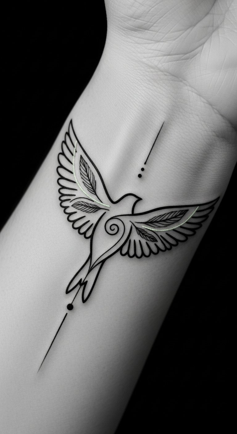 This design concept uses interlocking geometric motifs—triangles, hexagons, and flowing curves—outlined in fine black ink with glow-reactive pigments filling select facets so the piece remains subtle by day and electric under black light; it symbolizes the harmony between structure and spirit, each sharp angle representing clarity and every curve suggesting movement and liberation. Ideal placements include the forearm wrapping toward the wrist for visibility and interaction, the upper back centered along the spine for a powerful vertical statement, or the calf for a dynamic, wearable canvas that reveals its luminous personality in nocturnal or festival settings.