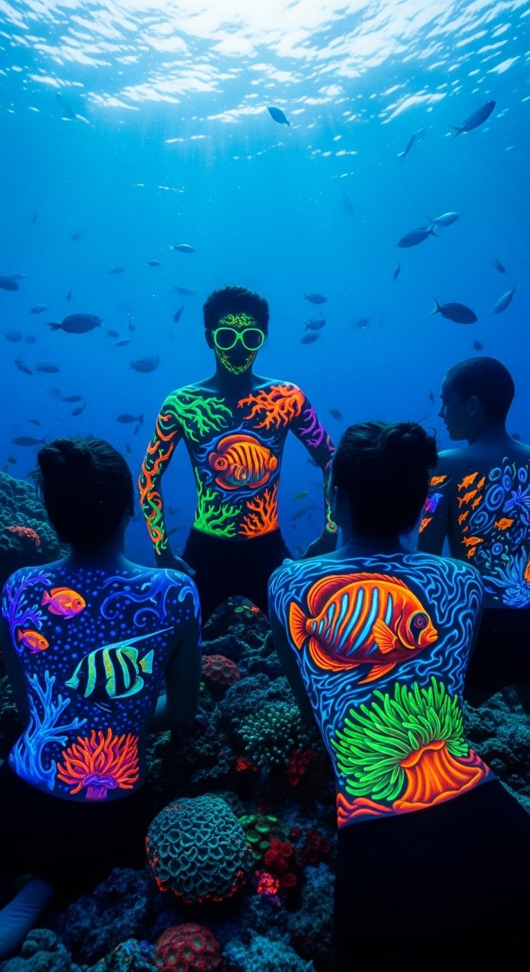 This design symbolizes transformation, freedom, and the hidden radiance within—neon fish and coral representing resilience and the vibrant life that exists beneath calm surfaces.